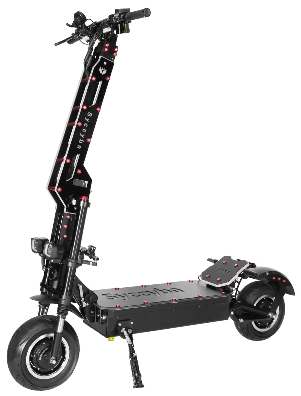 Пневматические шины с агрессивным протектором и передняя и задняя подвеска обеспечивают превосходное сцепление с дорогой и комфортное передвижение даже по неровной местности. Для безопасности в темное время суток самокат оборудован передними фарами и стоп-сигналом, улучшая видимость водителя и повышая уровень безопасности во время движения. Syccyba R12 Pro обладает легкой и прочной рамой, что облегчает его транспортировку. При весе всего 78 кг этот электросамокат сочетает в себе высокую мощность и проходимость с удобством использования.