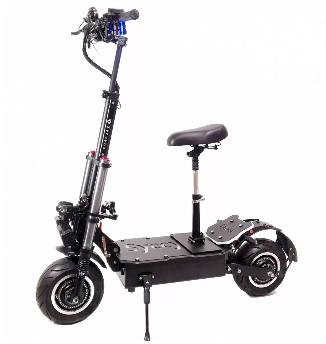 Syccyba R12 Pro оснащен мощными аккумуляторами, обеспечивающими запас хода до 120 км. Также электросамокат оборудован электродвигателем мощностью 6000 Вт, который позволяет развивать максимальную скорость до 90 км/ч.