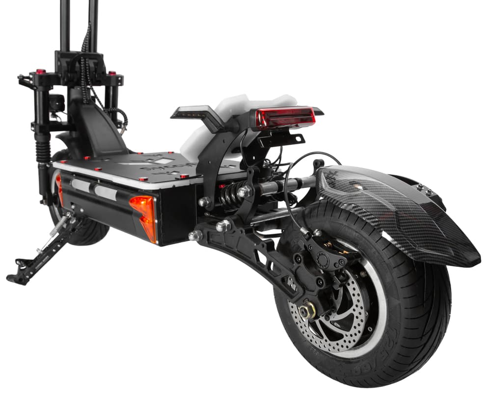 Максимальная мощность в 10 000 Вт позволяет развивать скорость до 110 км/ч, а запас хода в 100 километров обеспечивает длительное использование без подзарядки. При собственном весе в 69 кг, самокат выдерживает нагрузку до 200 кг, что делает его подходящим для взрослых и подростков, с любым типом телосложения.