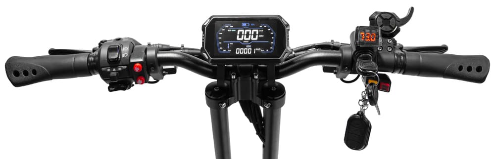 Самокат оснащён передними фарами, стоп-сигналом и поворотниками, которые обеспечивают безопасность на дороге. Передний амортизатор и задний регулируемый воздушный амортизатор делают поездку комфортной даже по неровной поверхности.