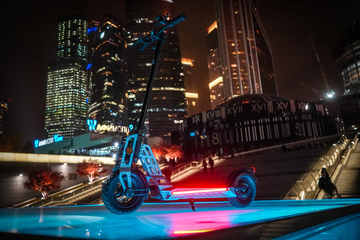 Самокат оснащен двумя фарами NANOLED со сверхъяркими светодиодами CREE, которые отлично знакомы профессиональным покорителям бездорожья. Яркий и крупный стоп-сигнал электросамоката хорошо заметен в любое время суток, а полоса подсветки вдоль деки обеспечивает дополнительную безопасность во время поездок в темноте.