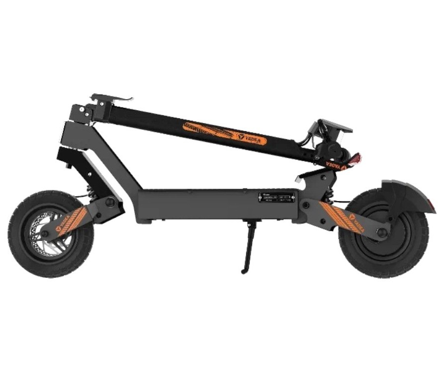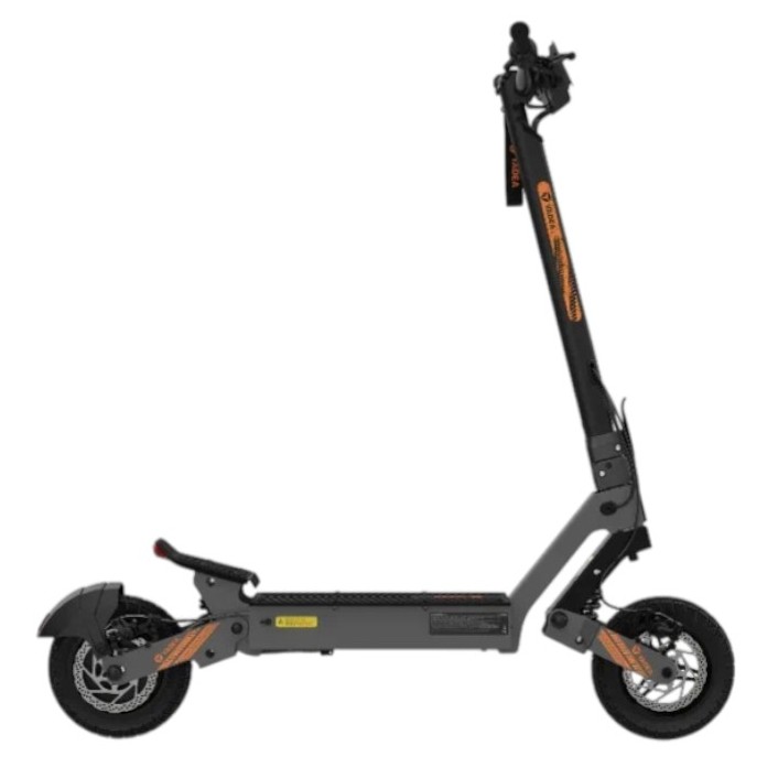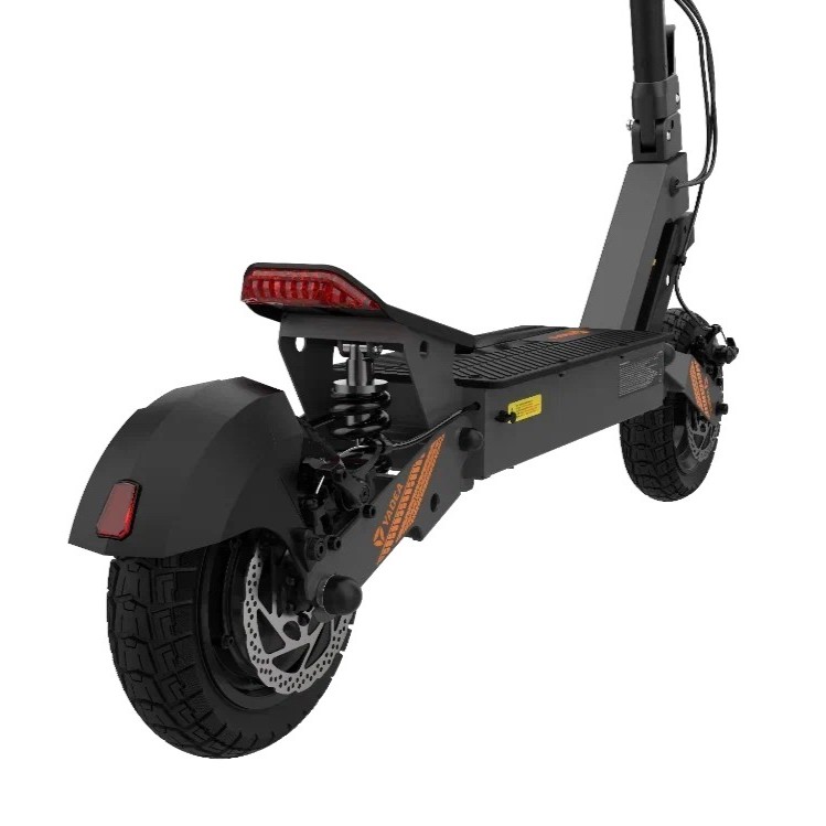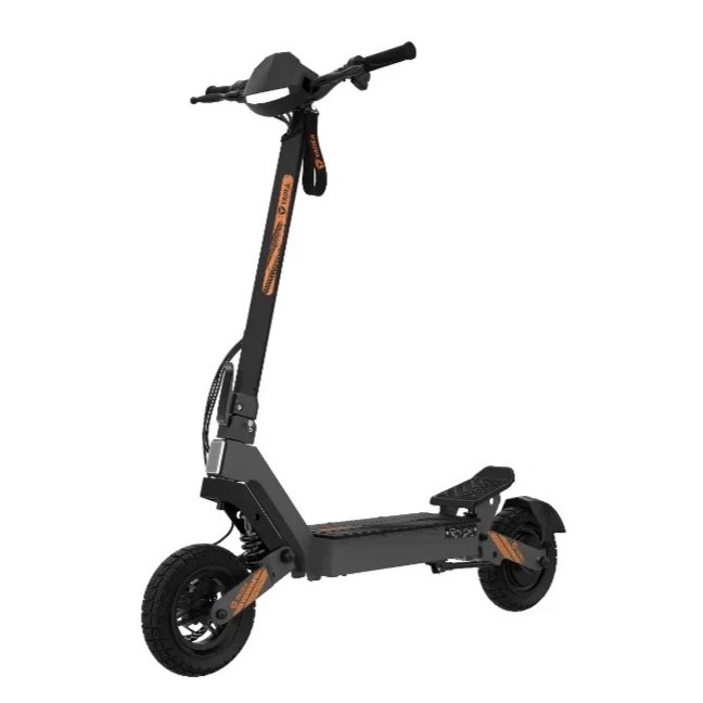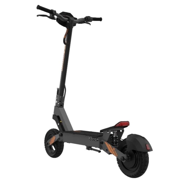 Конструкция адаптирована для сложных условий: установлены прочные бескамерные шины диаметром 10" и двойная пружинная подвеска — как спереди, так и сзади, что обеспечивает комфортную езду по выбоинам и грунтовке. За безопасность отвечает комбинированная тормозная система: на переднем колесе — дисковый двойной тормоз, на заднем — дисковый + электрический тормоз, что гарантирует быструю остановку даже на высокой скорости.