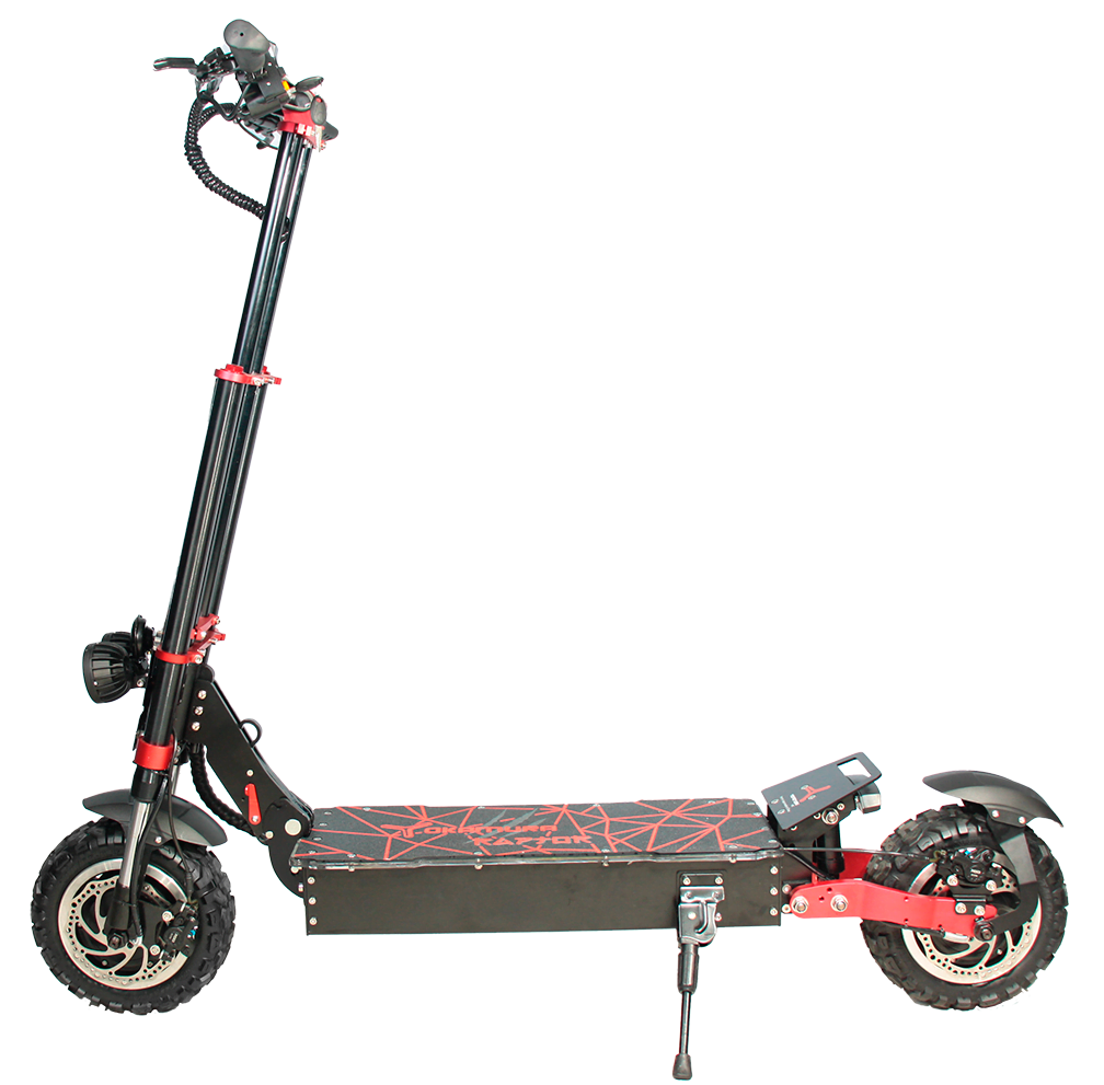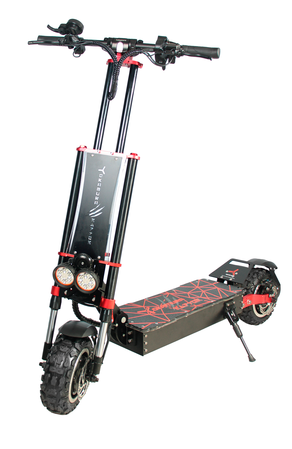 ЭЛЕКТРСАМОКАТ YOKAMURA Raptor 11 - это абсолютная новинка 2020 года создана высококвалифицированными инженерами компании. Все отточено до мелочей, надежная подвеска в виде мотовилки, отлично справляется с любыми не ровностями и при любых скоростях. Мощные новые мотор колеса по 3000 Вт каждое, имеет не повторимую начинку из новейших магнитов шириной 6 см, при помощи которых максимальная скорость которую может набрать самокат является свыше 90 км/ч. Набор скорости стал очень плавный и управляемый при помощи умных мозгов самоката, в нем установлены самые новые синусные контролеры по 45 ампер каждый, что является на сегодняшний день трендом в индустрии электротранспорта.
