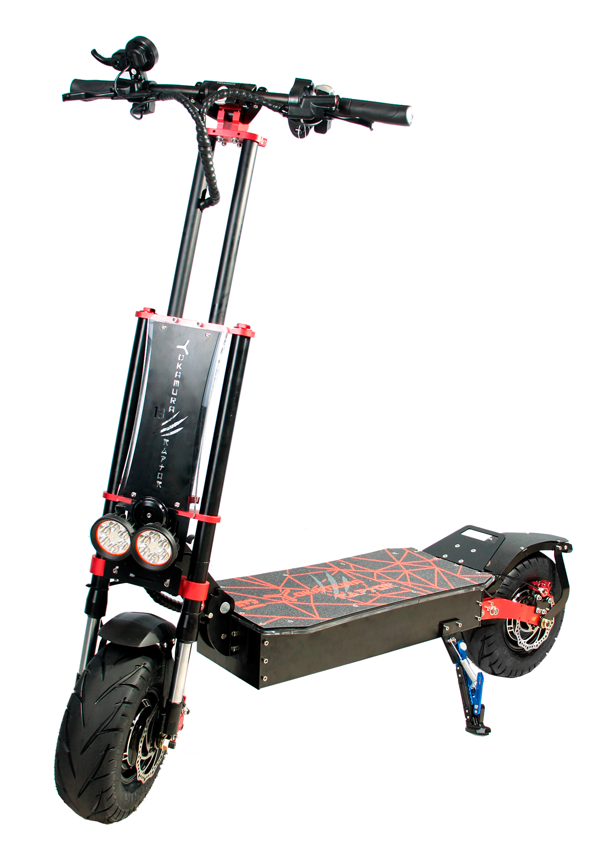 Великолепный дизайн, двойная подсветка самоката, отличные гидравлические тормоза и лучшая мото вилка спереди- это все Yokamura Raptor 13.