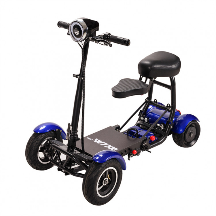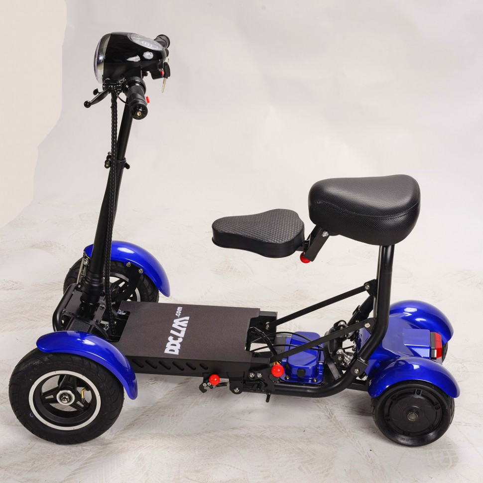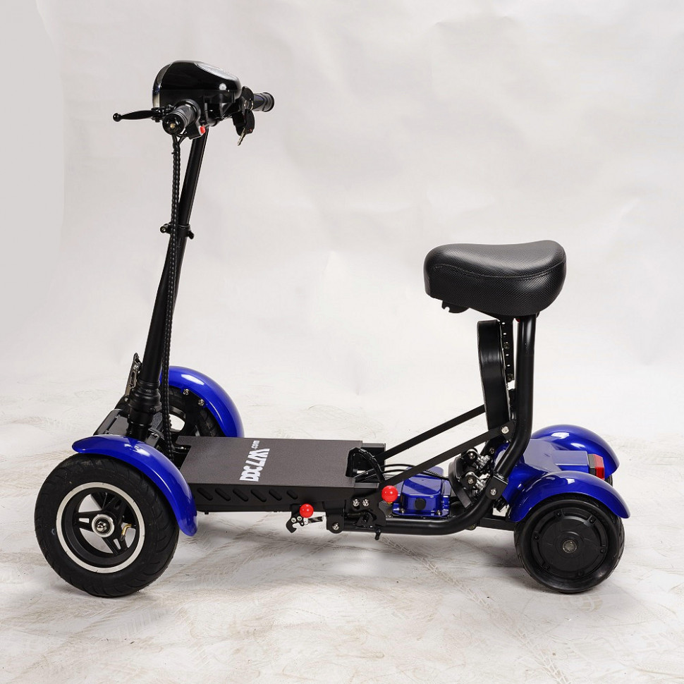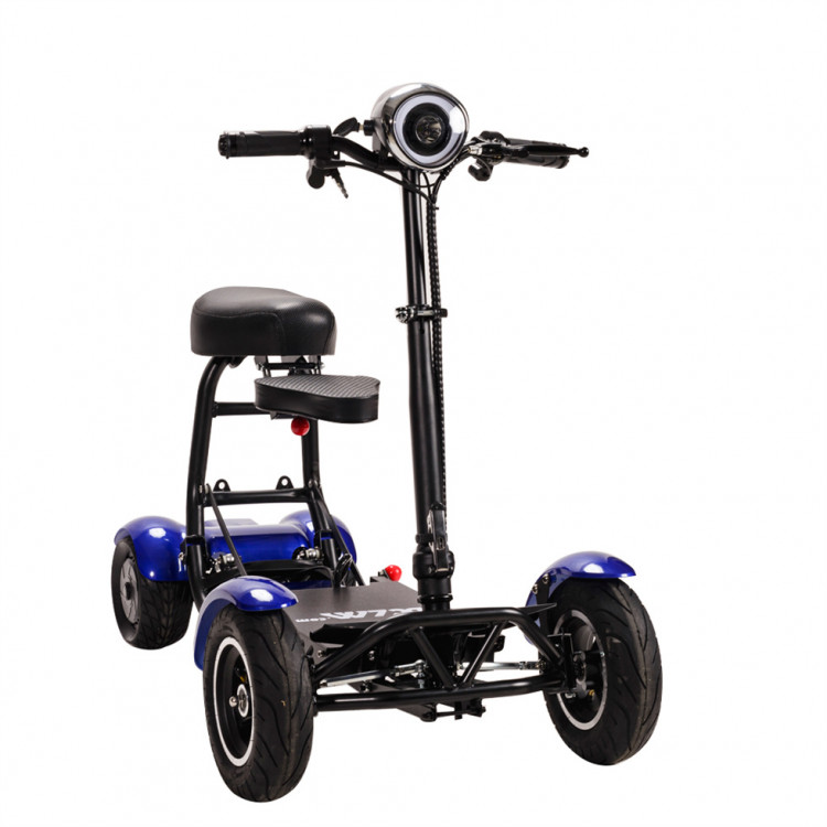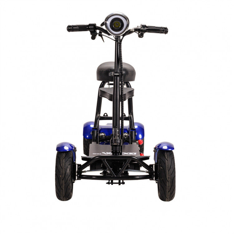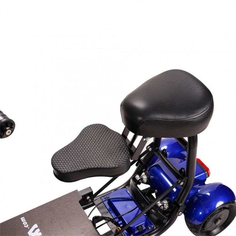 Характеристики включают в себя регулировку высоты руля от 55 до 70 см, мягкое комфортное сидение шириной 40 см и глубиной 38 см, а также регулировку вылета сидения вперёд до 12 см. Дека имеет размеры 80 см по длине и 27 см по ширине, обеспечивая комфортное размещение ног. Пользователь может выбирать между тремя скоростными режимами (6, 12, 18 км/ч) с помощью переключателя на правой рукоятке. Также встроены стоп-сигнал, головной фонарь (2 режима), кнопка включения заднего хода R и звуковой сигнал. Дополнительно предлагается возможность приобретения тканевой сумки на руль и/или задней металлической корзины.