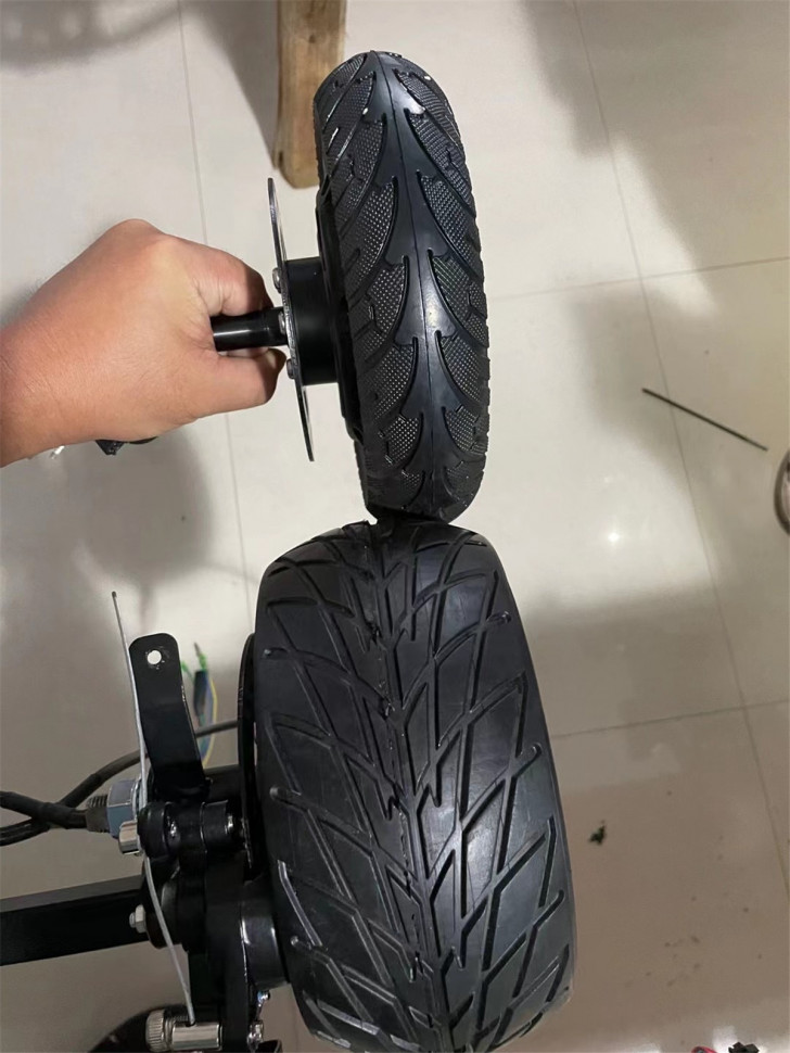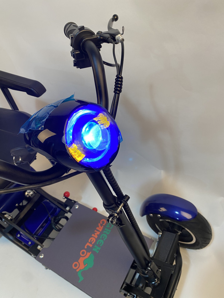 Электротрицикл оснащен двумя задними мотор-колесами общей мощностью 500Вт, позволяющими достигнуть скорости до 18 км/ч при максимальной загрузке в 120 кг. Запас хода составляет до 15 км. Для удобства перемещения, трицикл легко складывается вдвое и тащится за ручку на передних колесах, аналогично среднему чемодану (при складывании сиденье необходимо отстегнуть от самоката). Эта модель обладает отличной курсовой устойчивостью в поворотах благодаря геометрии колес и низкому центру тяжести.