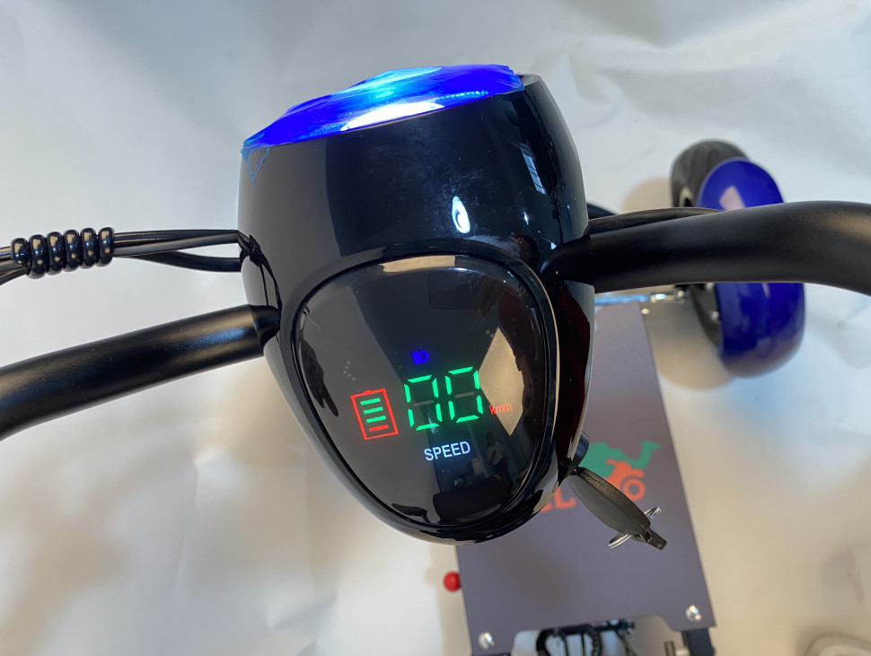 Трицикл оснащен комфортным сиденьем и широкой площадкой для удобства размещения взрослого человека. Управление вперед-назад осуществляется поворотом рукоятки газа, а торможение выполняется сбросом газа и использованием рычага тормоза на левой ручке. На руле размещены кнопки для звукового сигнала, света, переключения скоростей и включения заднего хода R. Корпус светодиодной фары также служит информационным LED-дисплеем, отображающим данные о заряде батареи.