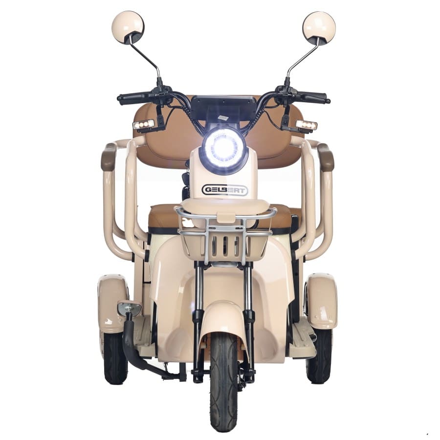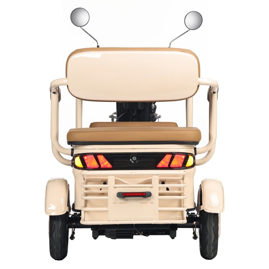 Одной из ключевых особенностей электротрицикла является его просторный салон, который оснащён двумя рядами сидений. Это позволяет комфортно разместить водителя и пассажиров, а также предоставляет дополнительные возможности для перевозки грузов. Заднее сиденье можно откинуть, открывая доступ к вместительному багажнику, что значительно расширяет функциональность модели. Две большие корзины — спереди и сзади — обеспечивают достаточно места для хранения вещей, необходимых в дороге.