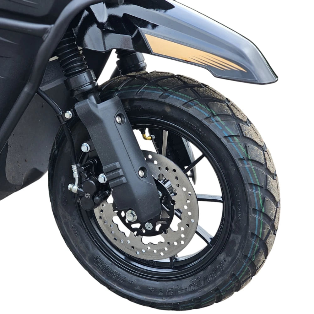 Для безопасности установлены двухпоршневые гидравлические дисковые тормоза спереди и сзади — одна из самых эффективных систем торможения, обеспечивающая быстрое и надёжное замедление даже на высокой скорости. Подвеска включает передние и задние амортизаторы, которые эффективно смягчают удары от неровностей дороги. Колёса диаметром 12 дюймов обеспечивают хорошее сцепление и устойчивость на любом покрытии.