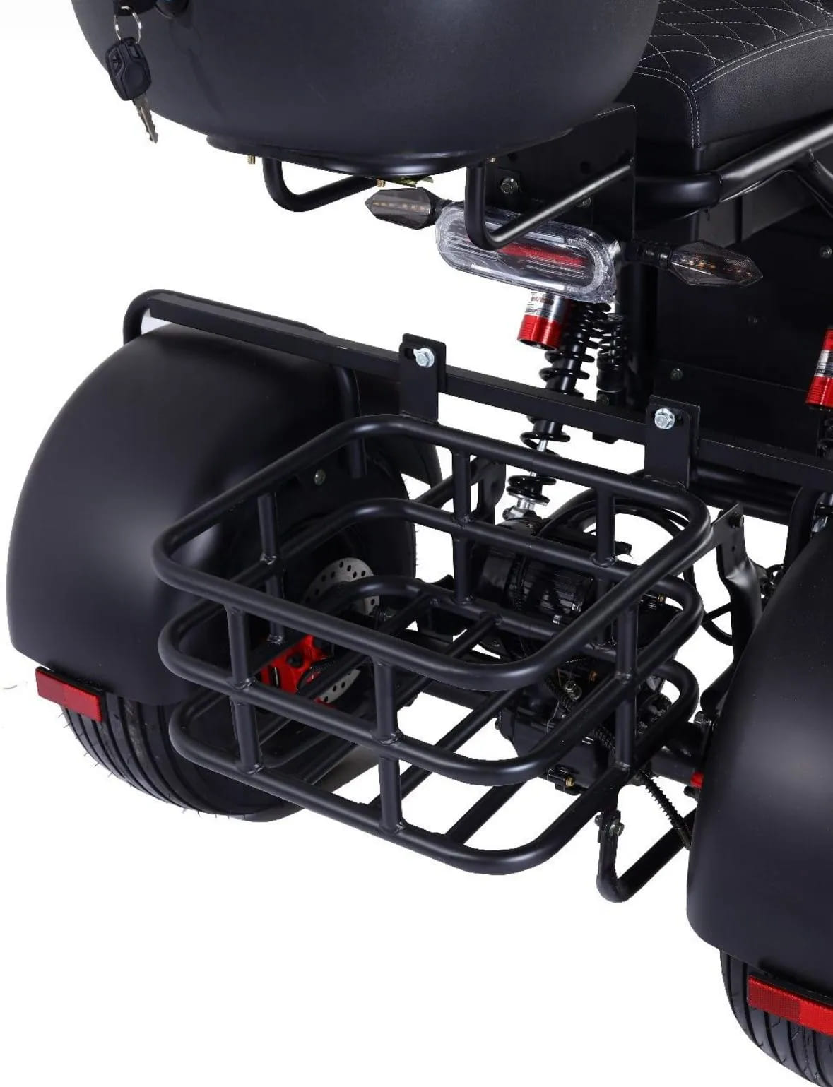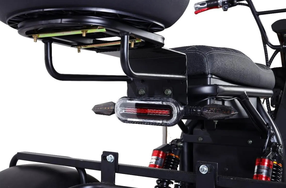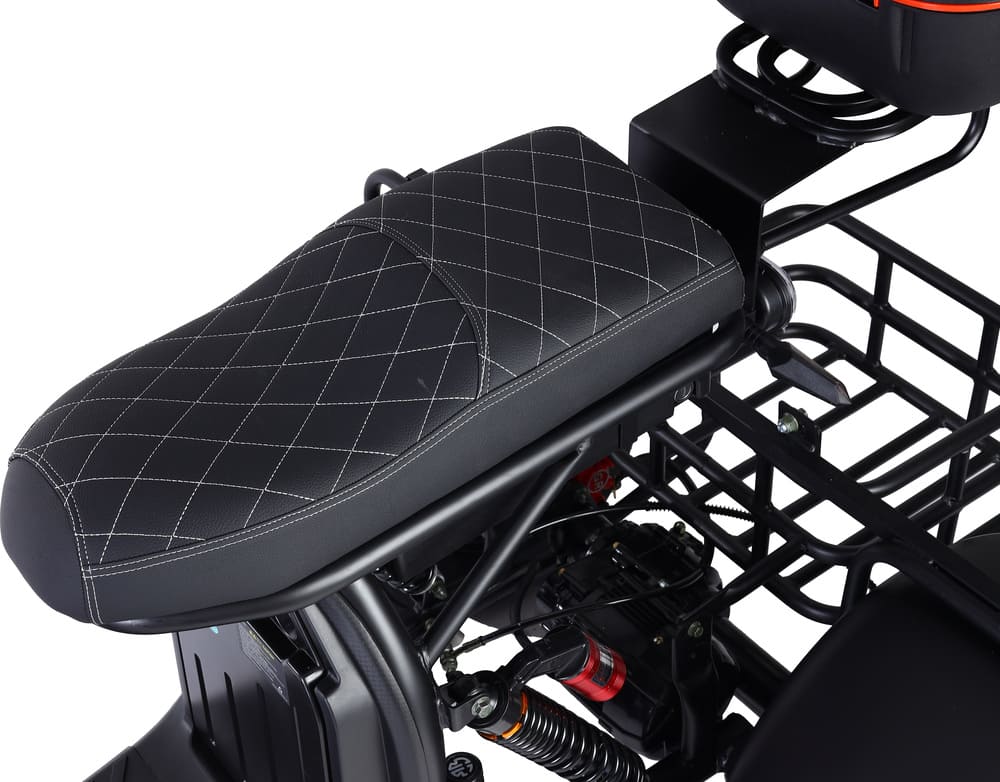 Трёхколёсная конструкция обеспечивает исключительную устойчивость, особенно при остановках, поворотах и движении по неровным поверхностям. Это делает скутер идеальным выбором как для пожилых пользователей, так и для коммерческих задач — доставки, логистики или эксплуатации на закрытых территориях. Прочная стальная рама выдерживает нагрузку до 220 кг, а общий вес модели составляет 75 кг, что говорит о его усиленной, надёжной сборке.