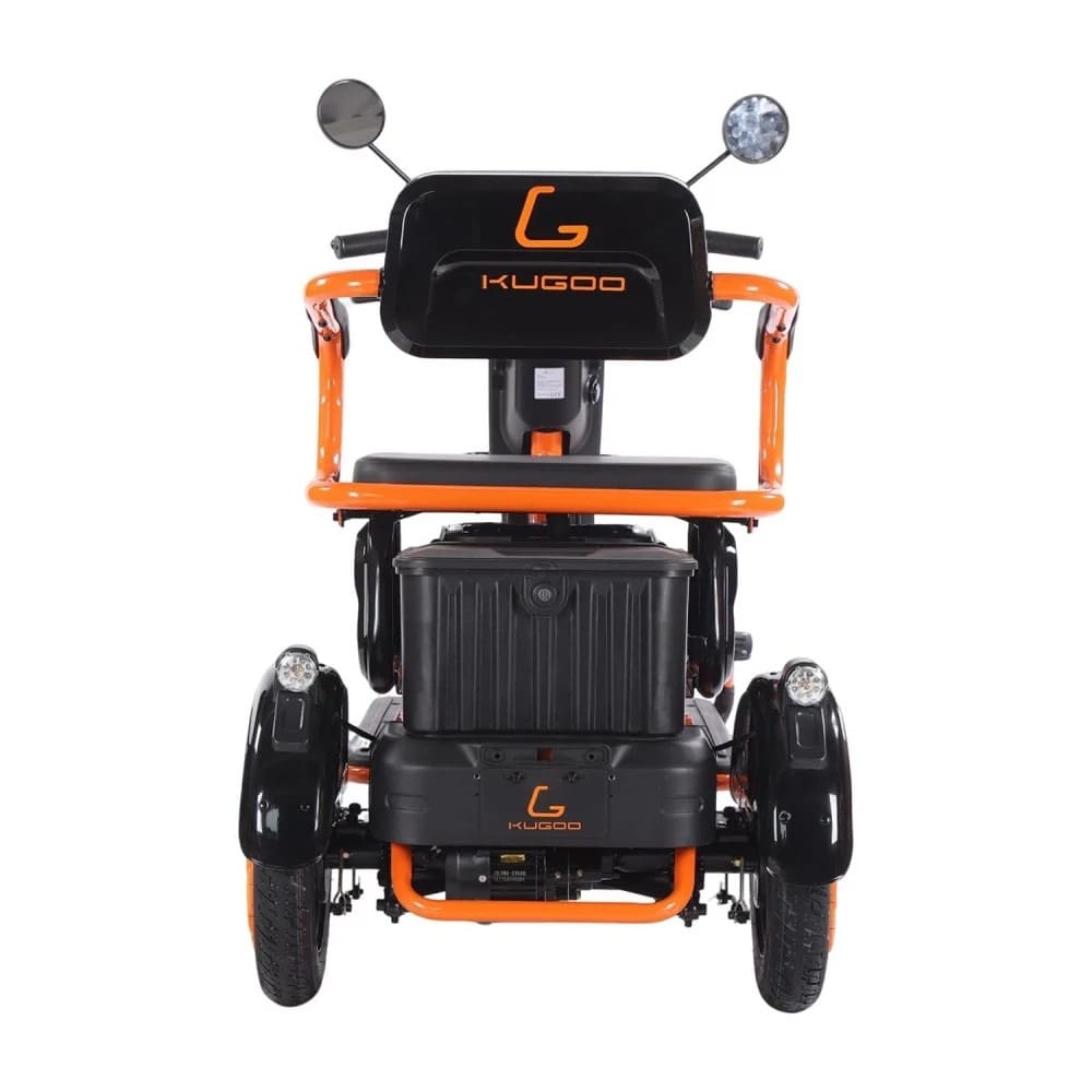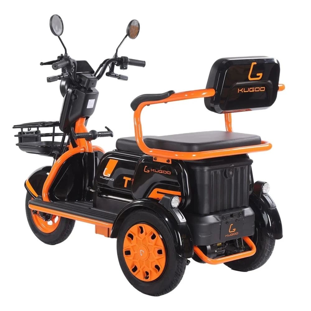 Kugoo T1 оборудован двумя сиденьями, багажником и корзиной для перевозки личных вещей или покупок. Дополнительно предусмотрены зеркала заднего вида, что повышает удобство и безопасность в плотном трафике. Это идеальный выбор для тех, кто ищет стильный, надежный и функциональный транспорт для города или дачи — экономичный, экологичный и готовый к любым задачам.