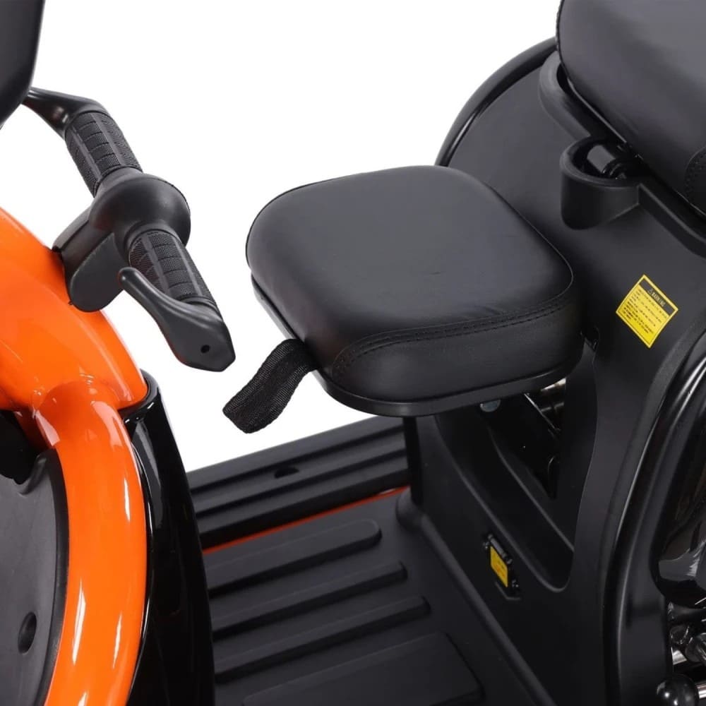 Для безопасной езды в любое время суток предусмотрен комплект освещения: яркая LED-фара спереди, задние стоп-сигналы и встроенные поворотники. Также установлены барабанные тормоза спереди и сзади, которые обеспечивают надежное замедление и минимальное обслуживание. Колеса диаметром 10 дюймов гарантируют устойчивость и уверенное поведение на дороге.