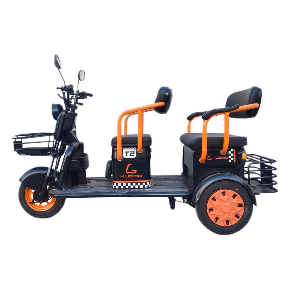 Общий вес электротрицикла составляет 133 кг, а его продуманная конструкция обеспечивает комфортную езду благодаря двухместному сиденью и балансу между устойчивостью и маневренностью. Это идеальный выбор для семейных поездок, доставки или повседневного использования в городе и за его пределами. Kugoo T2 сочетает в себе практичность, комфорт и современные технологии, делая каждую поездку легкой и приятной.