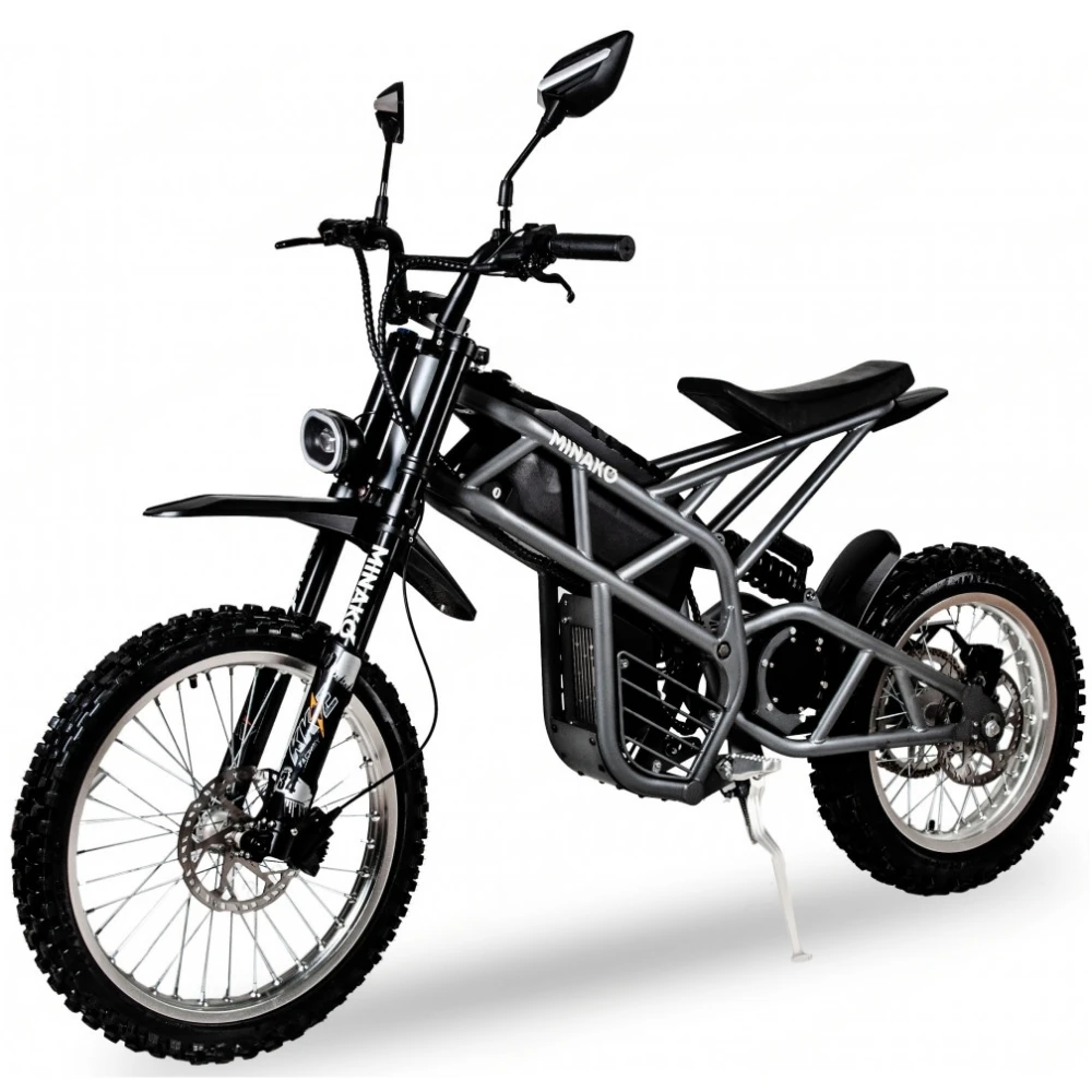 Электроскутер Minako CROSS привлекает внимание своим стильным дизайном, который напоминает современный мопед или крутую технику. Он оборудован большой светодиодной фарой и крепкой рамой, что подчеркивает его выдающиеся технические характеристики.