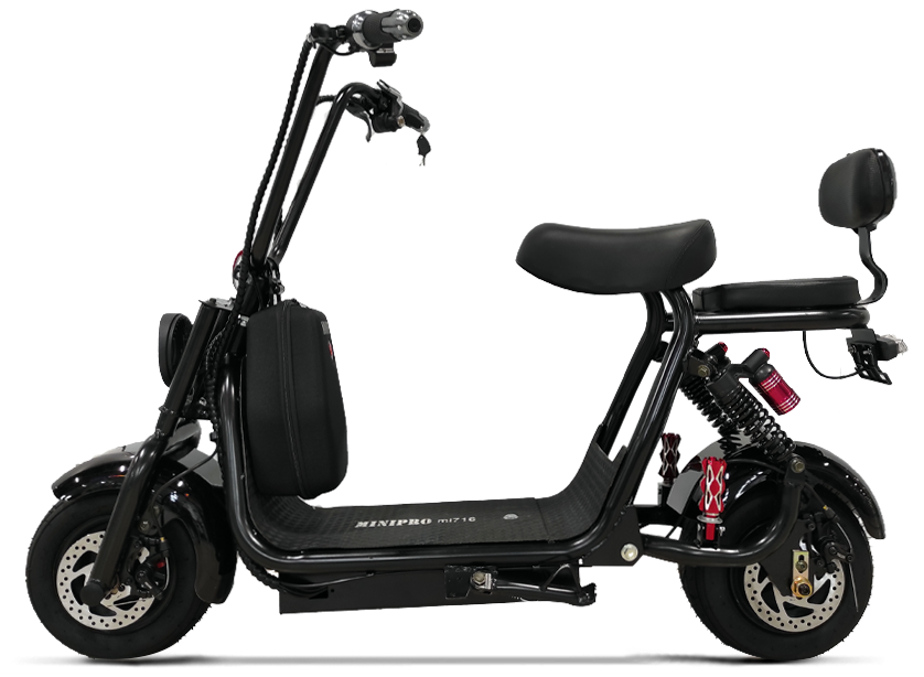 Одна из особенностей этого скутера — широкие 10-дюймовые колеса. Они обеспечивают нужную устойчивость на бездорожье и дополняют амортизаторы, «отскакивая» от препятствий на дороге. Пружины под сиденьями электроскутера minipro mi716 особенно пригодятся во время езды по неровностям. Выбирая эту модель не сомневайтесь, что любая поездка будет комфортной.