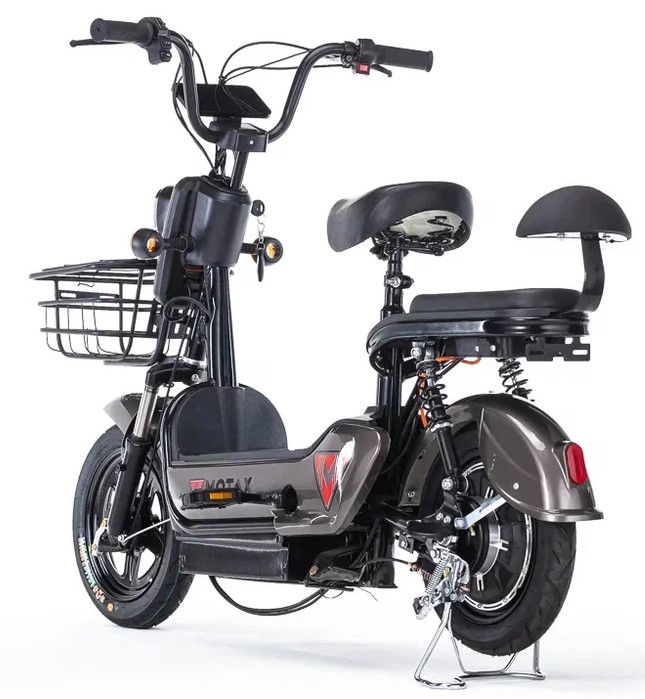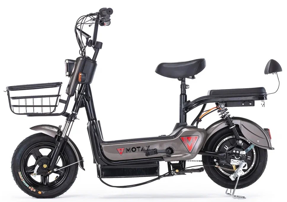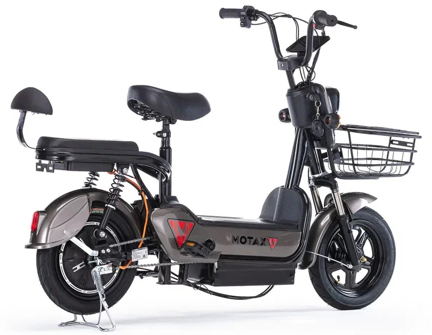 Новый электровелосипед от компании Motax – модель E-Not. С виду он очень похож на электроскутер, но, при детальном рассмотрении можно увидеть педали и цепной привод. Электровелосипед оснащён всем, что нужно современному пользователю – яркая передняя фара, поворотники с повторителями, большая вместительная корзина и второе сиденье со спинкой для второго пассажира.