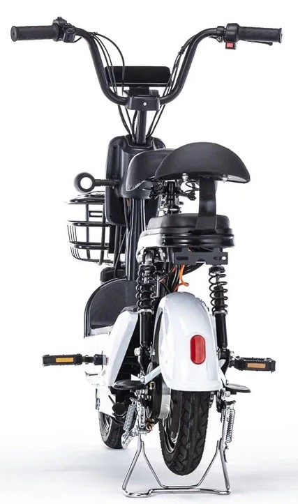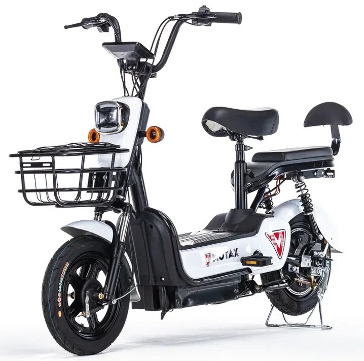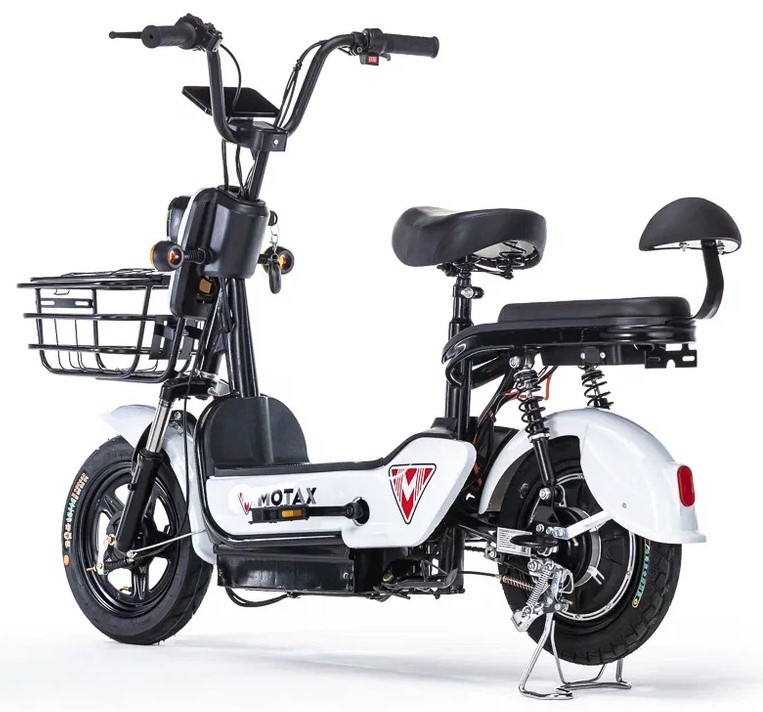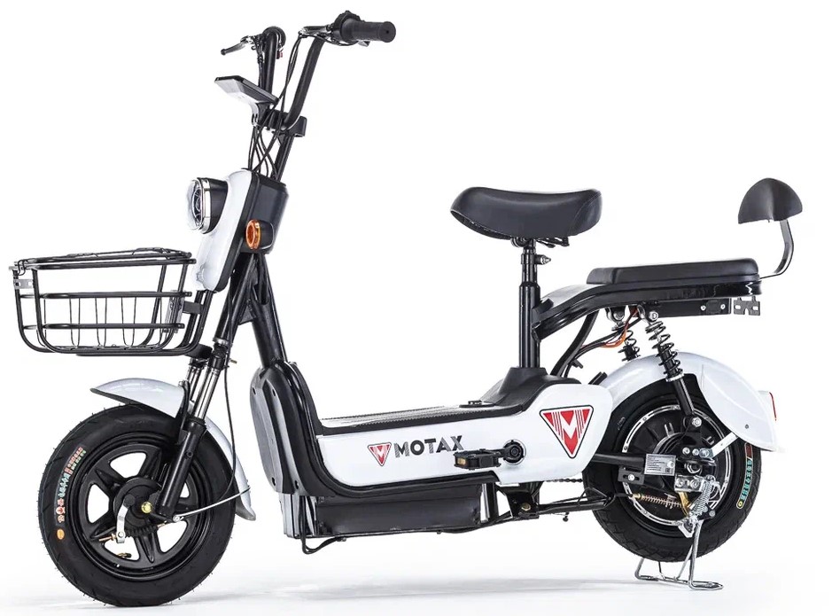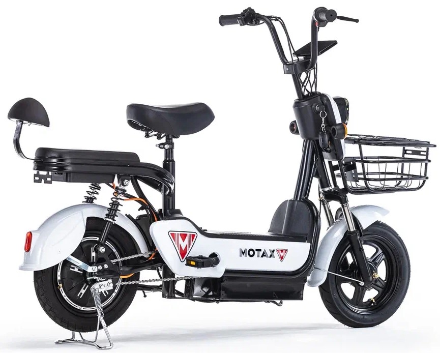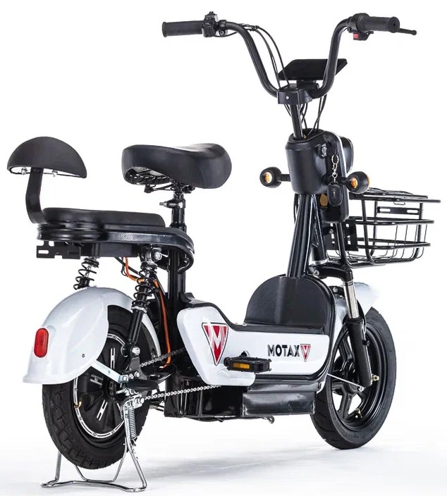 Новый электровелосипед от компании Motax – модель E-Not. С виду он очень похож на электроскутер, но, при детальном рассмотрении можно увидеть педали и цепной привод. Электровелосипед оснащён всем, что нужно современному пользователю – яркая передняя фара, поворотники с повторителями, большая вместительная корзина и второе сиденье со спинкой для второго пассажира.