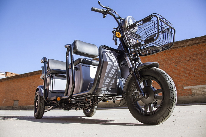 Трицикл имеет эстетически привлекательный внешний вид и заметен на фоне другого транспорта. Он оснащен всем необходимым функционалом и имеет корзины для транспортировки вещей.