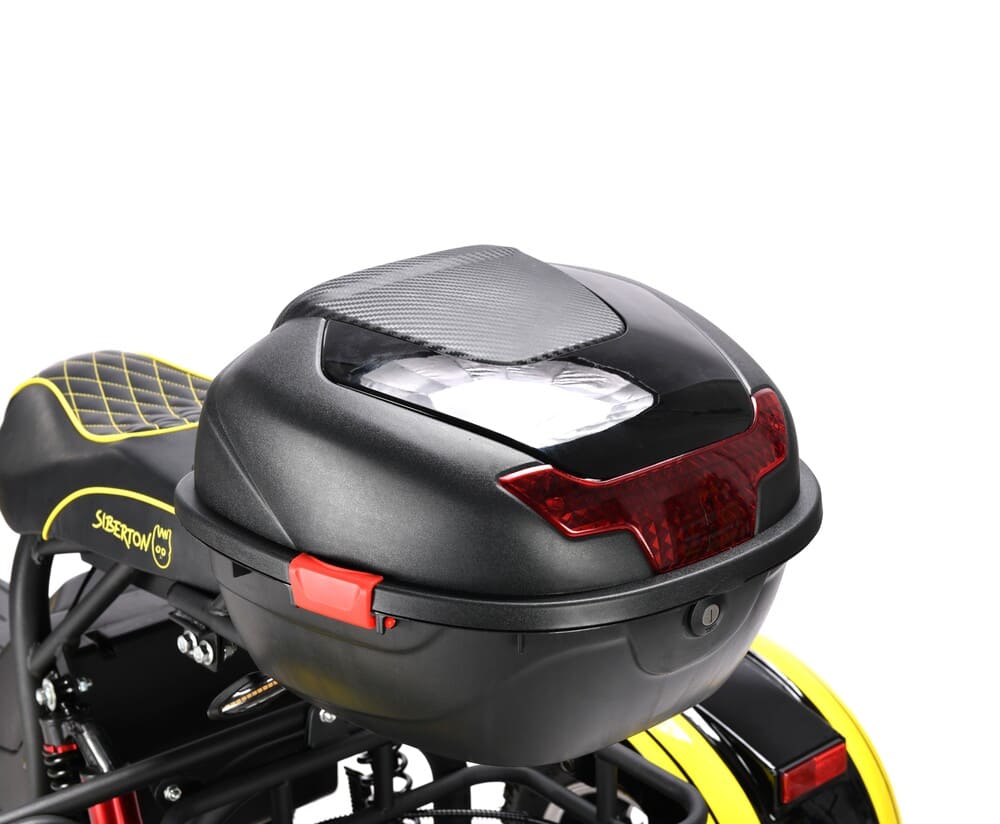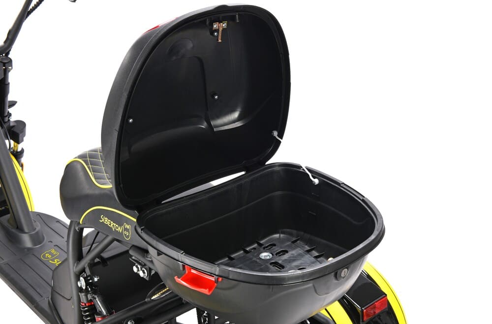 Комфорт и функциональность SIBERTON PRO TRIKE 3000W подчёркиваются его конструкцией. Передние колёса оснащены масляными амортизаторами, а задние — пружинной подвеской с масляными амортизаторами, что обеспечивает плавность хода даже на неровных поверхностях. Просторное мотоциклетное сиденье длиной 80 см, выполненное из износостойкой эко-кожи, делает каждую поездку максимально комфортной. Дополнительный багажник позволяет перевозить покупки или другие грузы, а встроенный кофр идеально подходит для хранения документов и мелких аксессуаров.