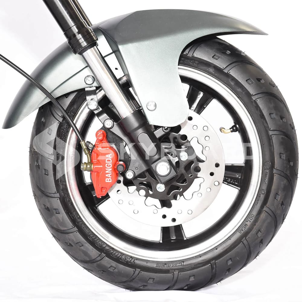 На передней панели находится LED-дисплей, который отображает все необходимые показатели, такие как скорость, пробег и уровень заряда аккумулятора. Емкость аккумулятора составляет 40А 60V, и его заряда хватит на поездку до 65 км. Мощность электромотора составляет 3950W, что позволяет достичь скорости до 67 км/ч.
