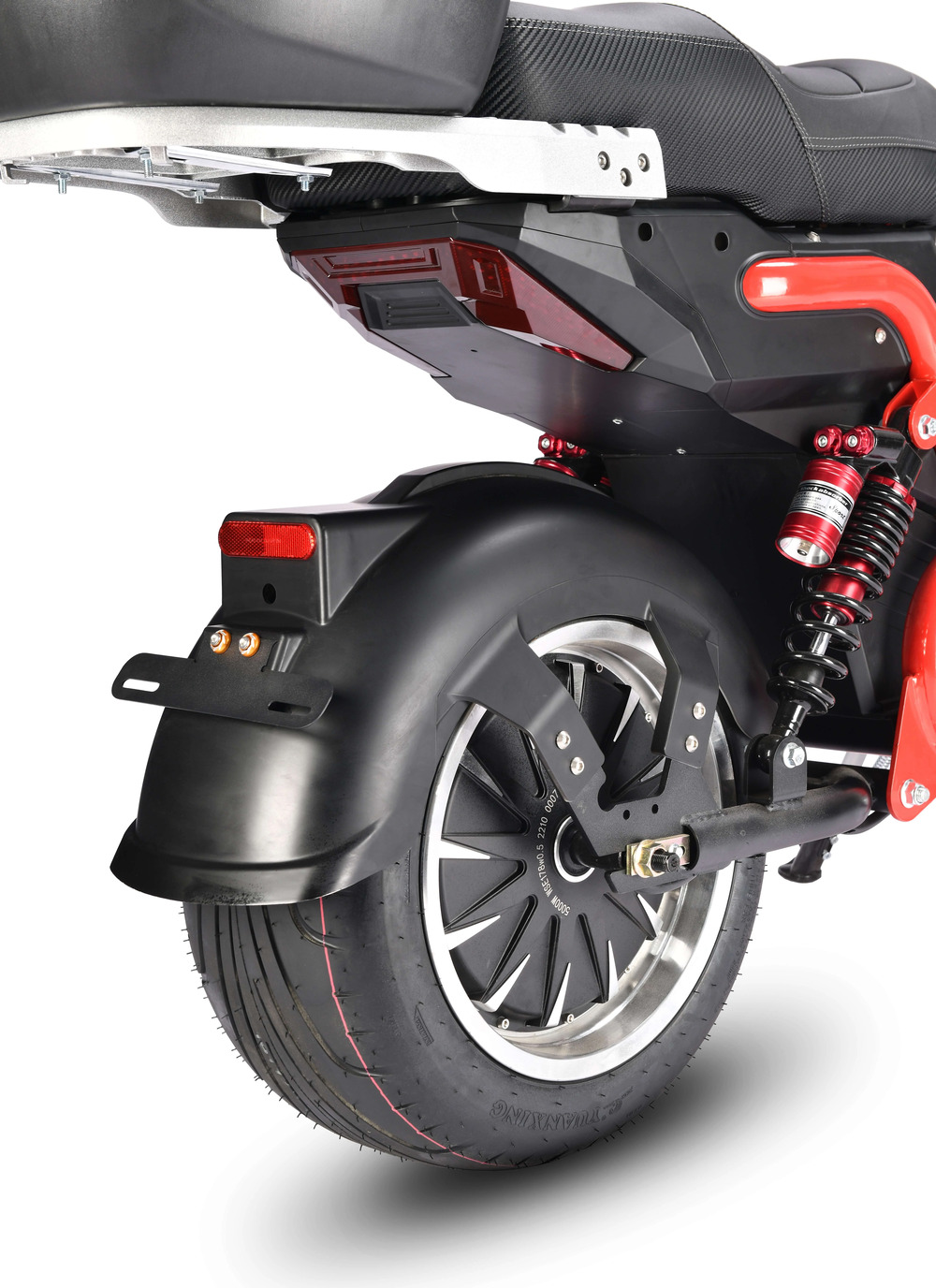 Электроскутер оснащён аккумулятором Li-Ion 60V 31Ah с балансировочной платой, который можно легко снять для зарядки. Мотор-колесо мощностью 5000W обеспечивает невероятную мощность и скорость до 75 км/ч.