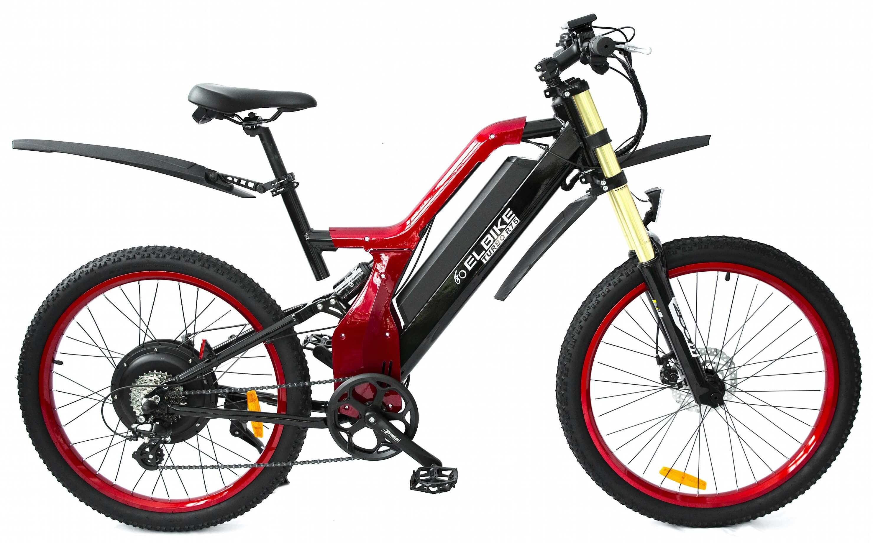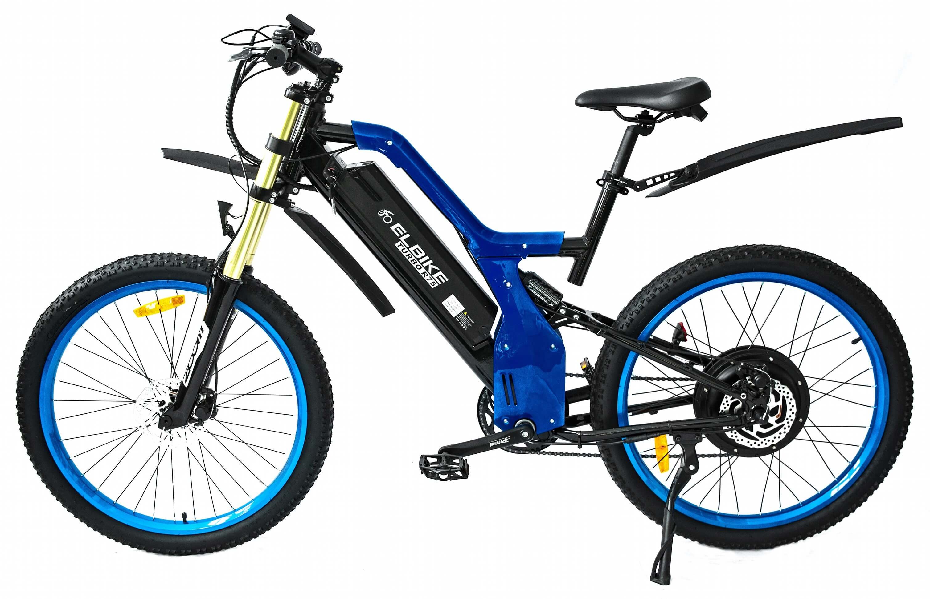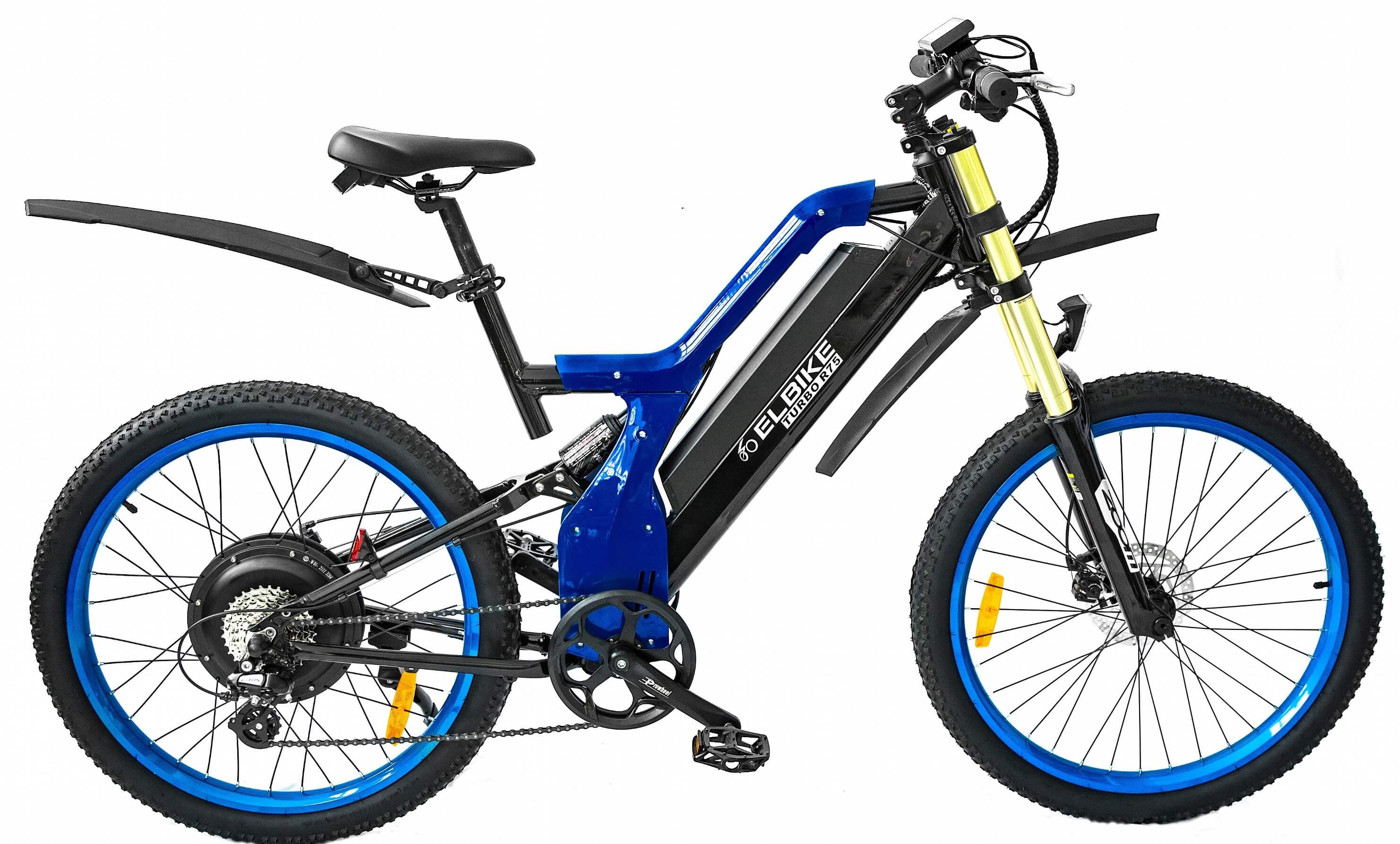 Электровелосипед ELBIKE TURBO R75 VIP – это самая мощная модель в линейке, которая работает на напряжении 48 вольт. Она оснащена мощным безредукторным мотором MXUS мощностью 1500 ватт и имеет ёмкий литий-ионный аккумулятор на 48 вольт и 16 ампер-часов. Благодаря этим характеристикам, велосипед способен разгоняться до 50 километров в час и проезжать расстояния до 75 километров без необходимости использовать педали, управляясь только ручкой газа. Также, в режиме педалирования, можно проехать до 110-120 километров.