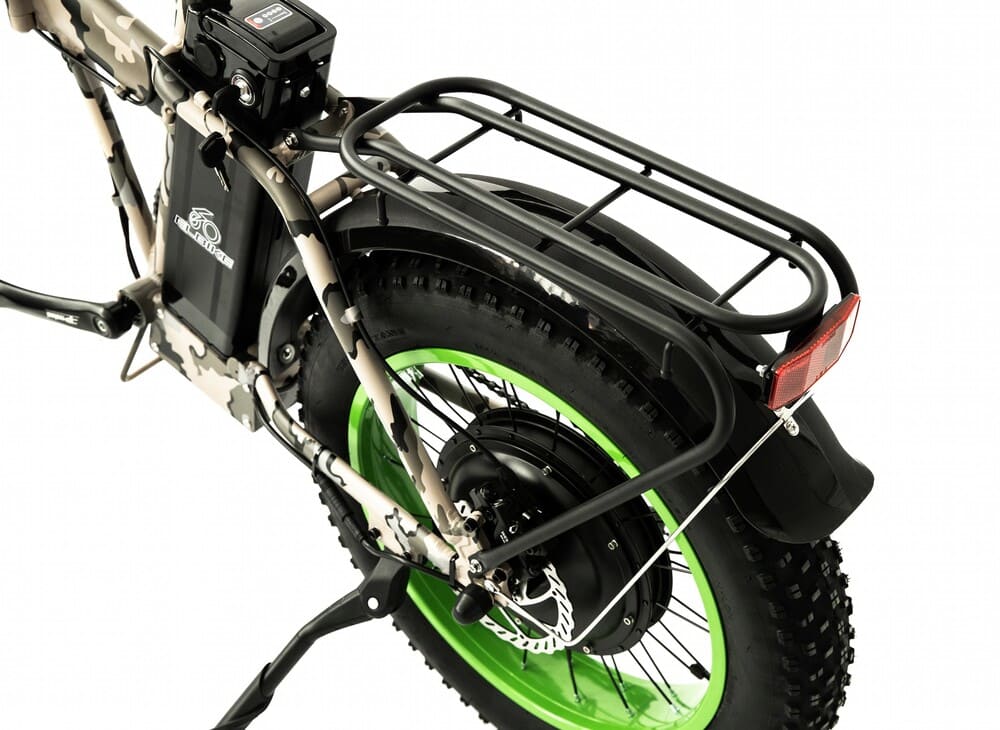 Elibike TAIGA 3 Twix cam оборудован багажником, что делает его удобным для перевозки мелких грузов или сумок. Стильный камуфляжный дизайн подчеркивает спортивный характер модели, а полный привод гарантирует уверенное поведение на любом покрытии — от асфальта до грунтовки. Это универсальное средство передвижения для тех, кто ищет комфорт, проходимость и современный внешний вид в одном устройстве.