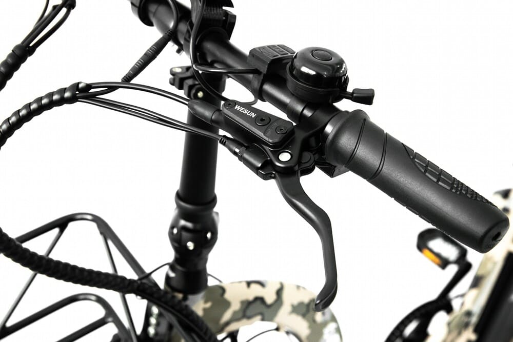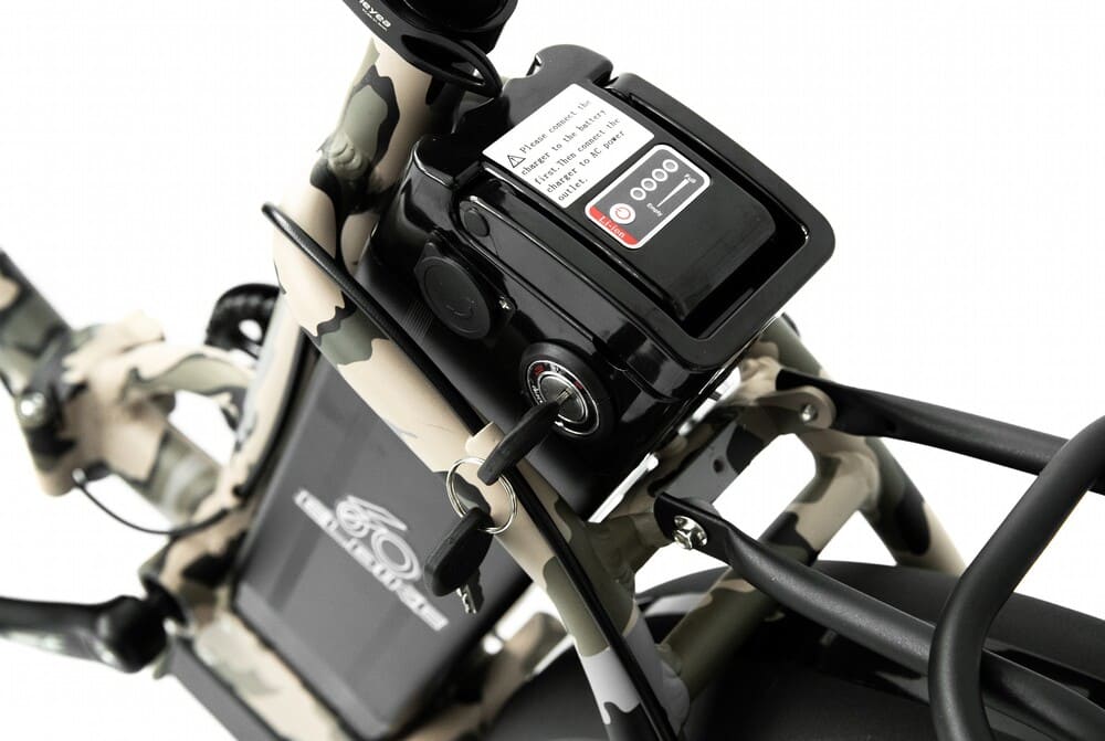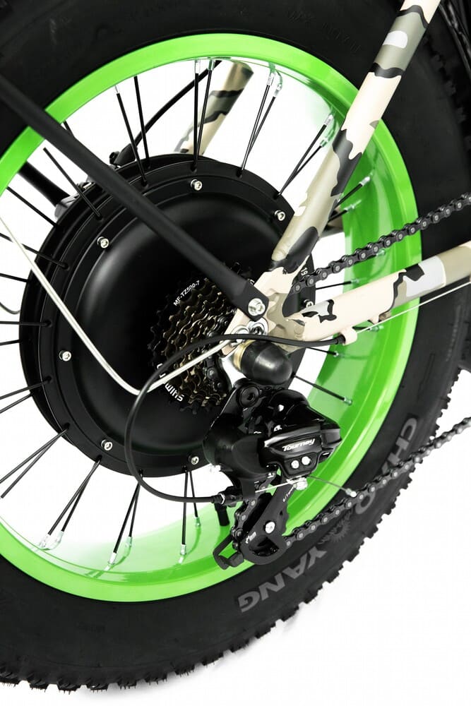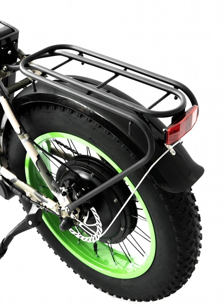 Безопасность движения обеспечивается продуманной системой торможения. Установленные гидравлические тормоза гарантируют надежное замедление даже на высокой скорости. Передняя подвеска и амортизатор поглощают удары на неровных участках, а широкие шины размером 20х4 обеспечивают отличное сцепление с дорогой. Также модель оборудована фарой и стоп-сигналом для комфортной езды в темное время суток.