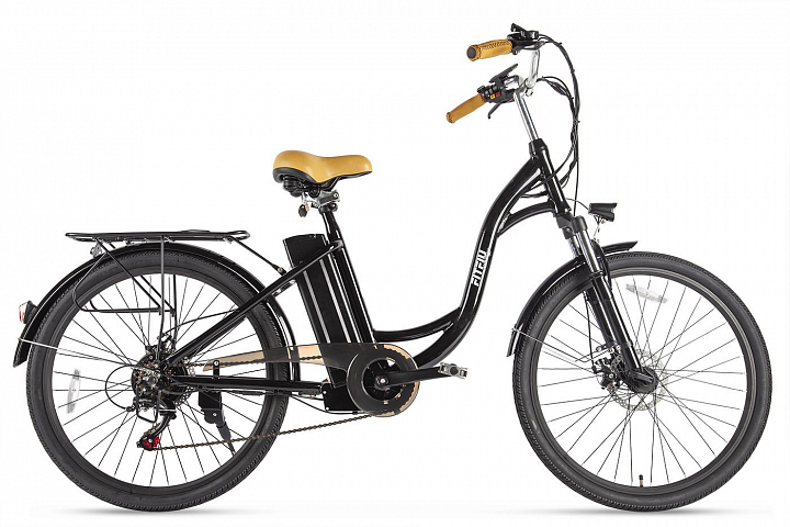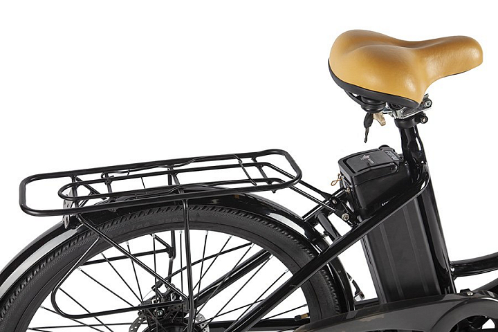 Этот электровелосипед оснащен механическими дисковыми тормозами с концевиками, которые выключают электромотор при торможении. В стандартной комплектации включены полноразмерные металлические крылья, передний фонарь и задний фонарь, надежный багажник и удобная подножка. Дополнительный стиль модели придают удобные коричневые грипсы, оформленные плетеной декоративной отделкой, а также эргономичное велосипедное седло средней ширины, обитое тем же материалом.