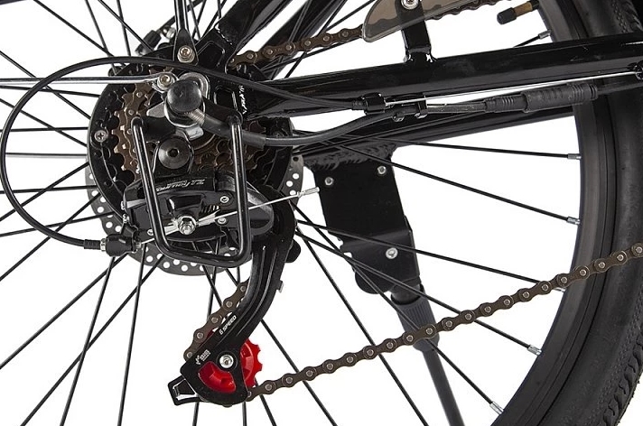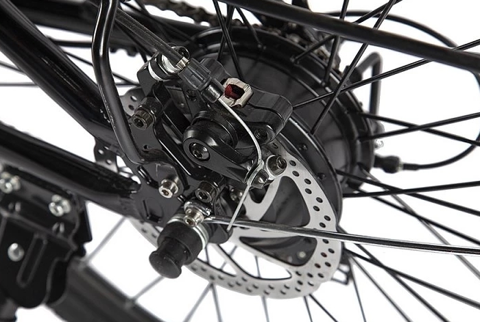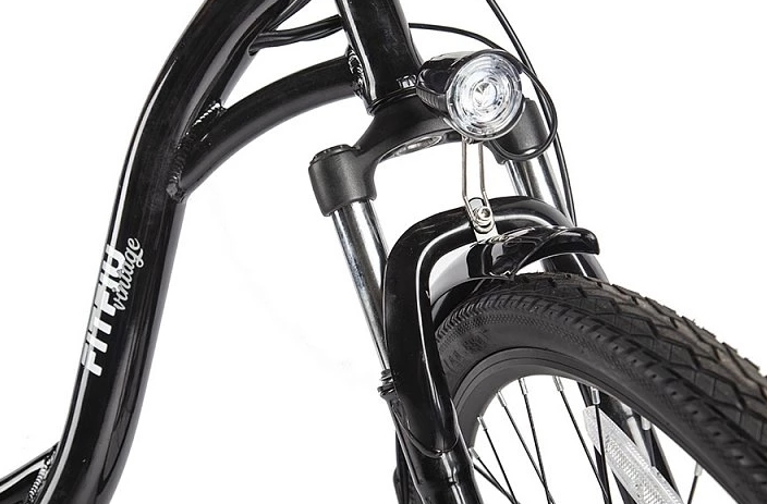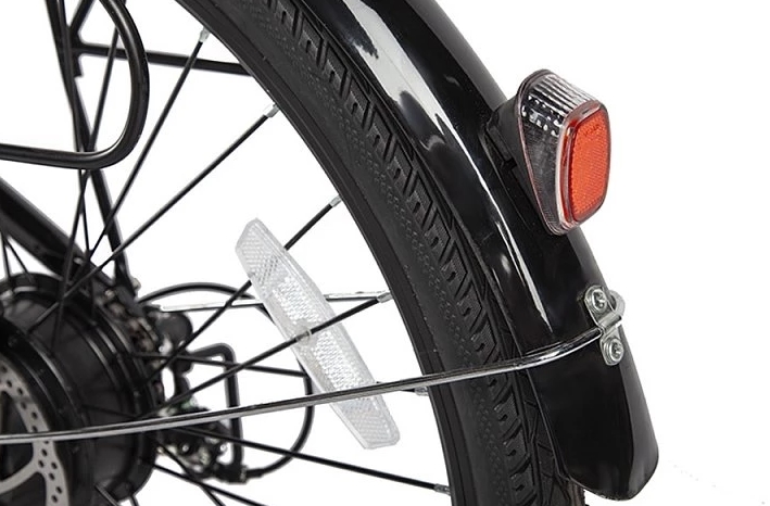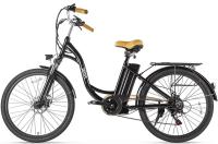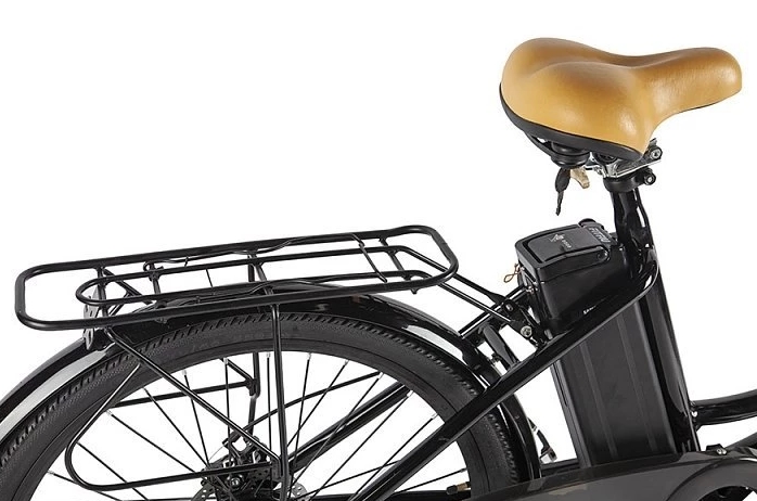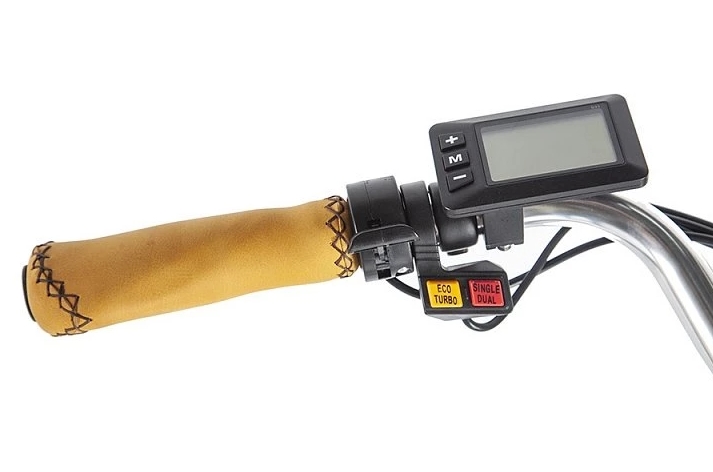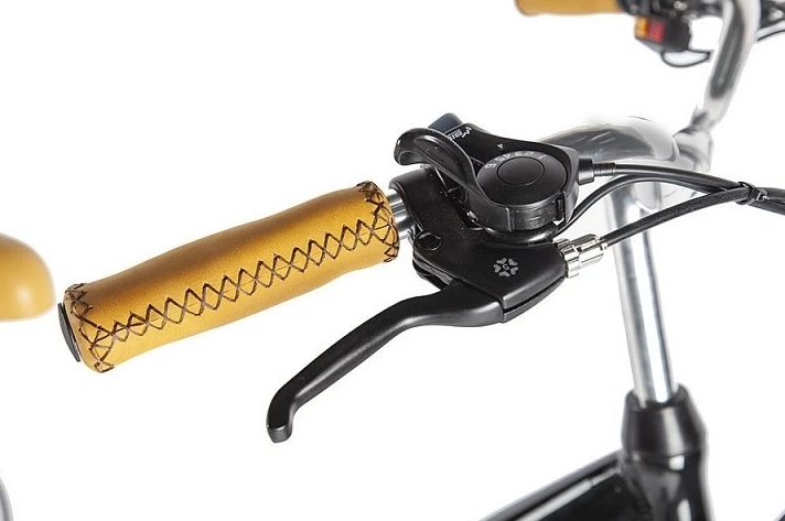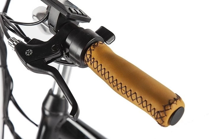 Этот электровелосипед оснащен механическими дисковыми тормозами с концевиками, которые выключают электромотор при торможении. В стандартной комплектации включены полноразмерные металлические крылья, передний фонарь и задний фонарь, надежный багажник и удобная подножка. Дополнительный стиль модели придают удобные коричневые грипсы, оформленные плетеной декоративной отделкой, а также эргономичное велосипедное седло средней ширины, обитое тем же материалом.