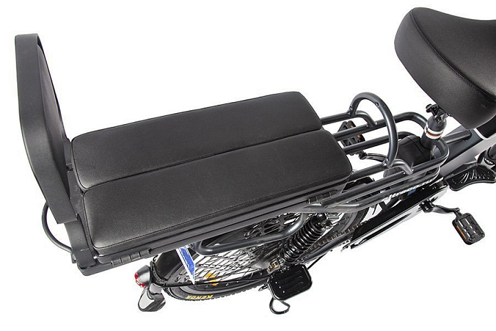 GREEN CITY e-Alfa GL оснащен мощным 500-ваттным hub-мотором, установленным в заднем колесе, и контроллером электродвигателя, размещенным на подседельной трубе. Этот электровелосипед позволяет разгоняться до максимальной скорости в пределах 30-35 км/ч и преодолевать расстояния до 40 километров на одном заряде аккумулятора. Велогибрид оборудован задними амортизаторами, что обеспечивает комфортную перевозку пассажиров на заднем сиденье. Кроме того, можно установить детское кресло на багажник или закрепить груз, при условии, что общий вес не превышает 130 кг.
