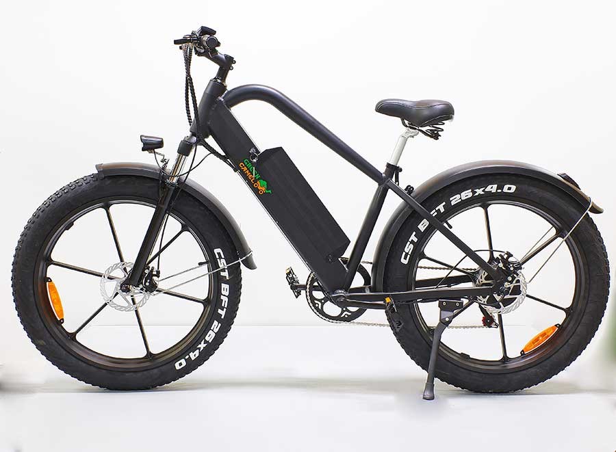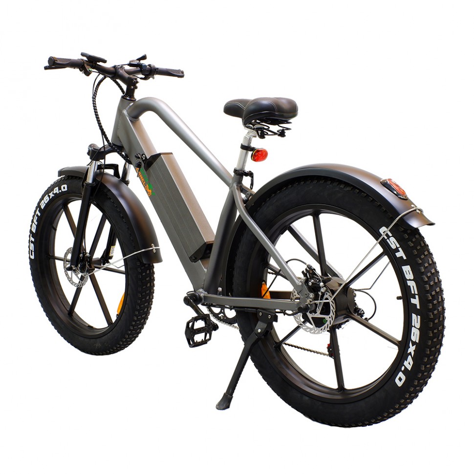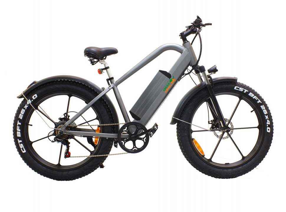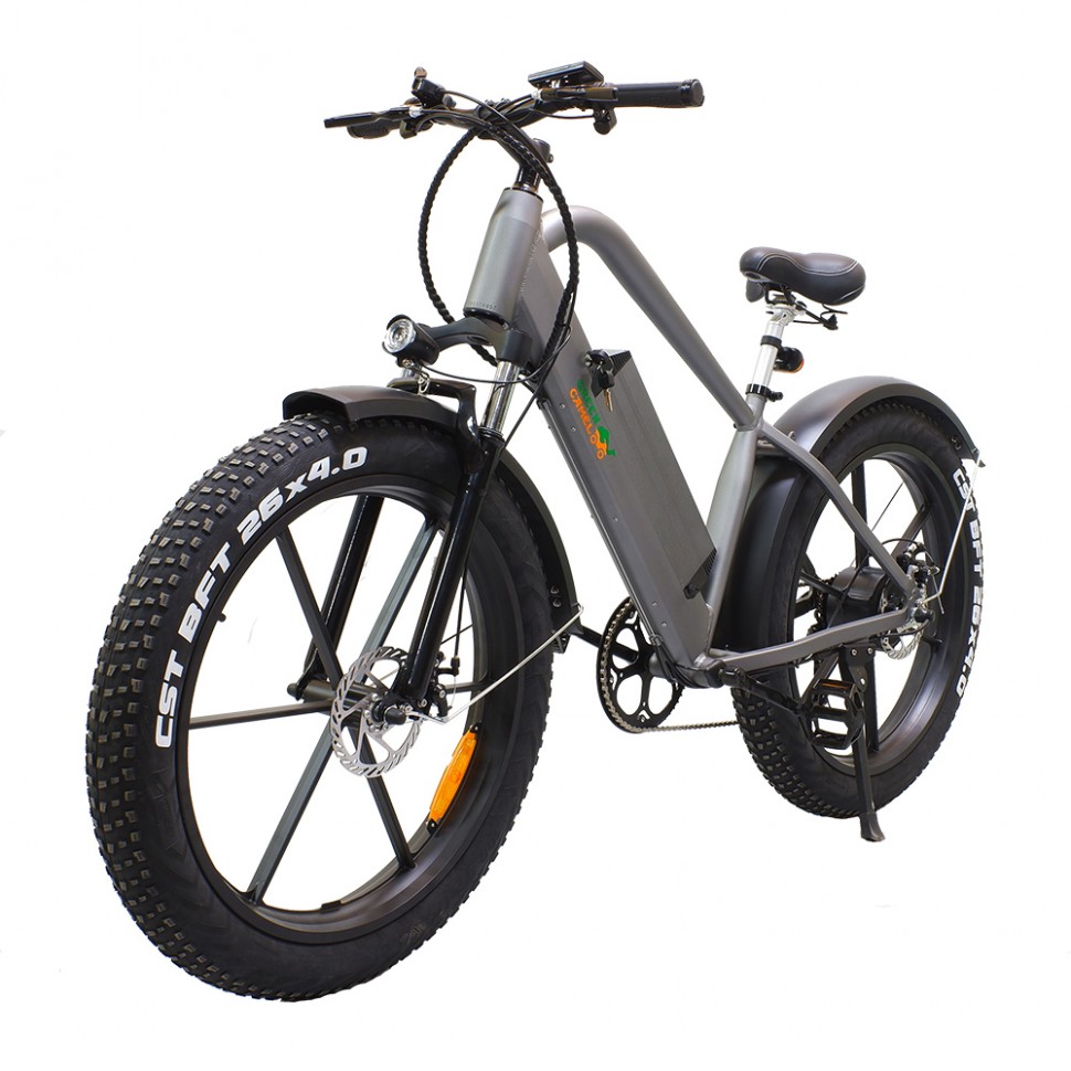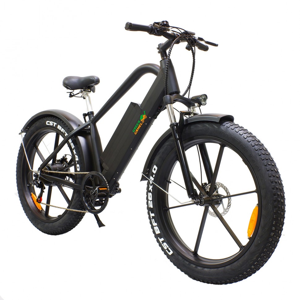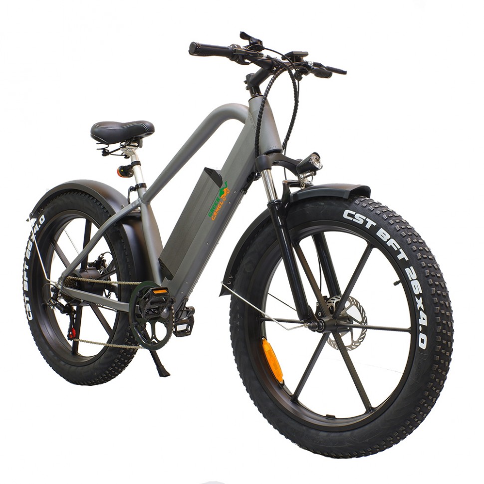 Агрессивный дизайн GreenCamel Хищник притягивает взгляды, усиленная оригинальная алюминиевая рама и большие фэтшины уверенно ведут себя как на городских неровностях, так и на пересеченной местности в пригороде. За уверенный набор скорости до 35 км/ч и продолжительный пробег в 45 км отвечают надёжный бесщеточный двигатель в колесе мощностью 500W напряжением 48V и энергоёмкая литиевая батарея 10Ah. Комплект дисковых тормозов обеспечивает экстренное торможение в любых погодных условиях. Модель представлена в чёрном матовом и антрацитовом матовом цветах и уже укомплектована светом, вело компьютером, широкими крыльями, подножкой, комфортным сиденьем с пружинами, зарядным устройством и быстросъёмной батареей для удобства зарядки дома. Успейте приобрести этот фэтбайк у надёжного производителя с отзывчивым сервисом на протяжении всей эксплуатации!