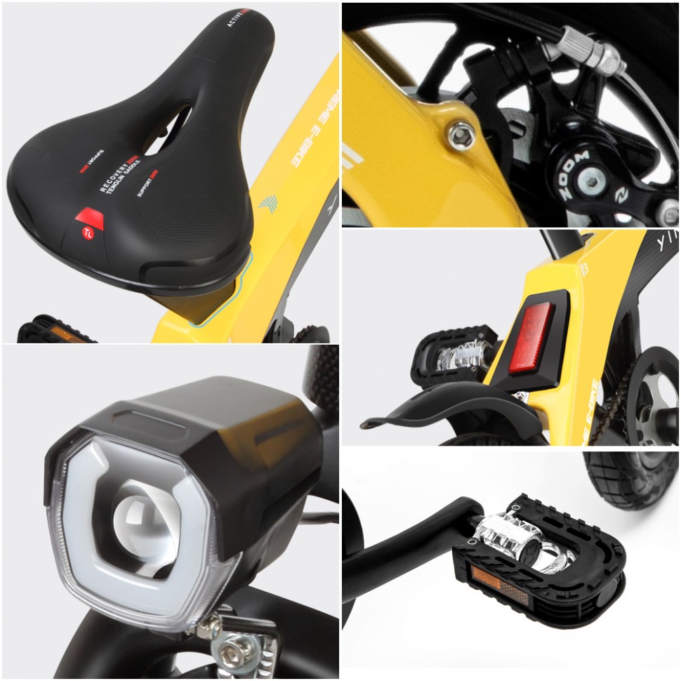 Представляем компактную складную модель электровелосипеда GreenCamel Carbon T3 (R14 250W 36V LG 7,8Ah) Carbon. Благодаря малому весу в 17,5 кг, электровелосипед удобен для ежедневных перемещений по городу, в том числе в электричках и метро. За безопасные остановки отвечают надежные дисковые механические тормоза. На велосипеде предустановлен передний и задний светодиодные ходовые огни с управлением на рулевом LED дисплее. Ездить на электровелосипеде GreenCamel Carbon T3 (R14 250W 36V LG 7,8Ah) Carbon можно в 3х режимах: без педалей полностью на электричестве с запасом хода до 50 км, с педалями в электрическом режиме - помощник до 100км, и без электричества на педальном приводе. Основной цвет модели - матовый чёрный с ярко-желтой рамой, заметной в потоке городского трафика.