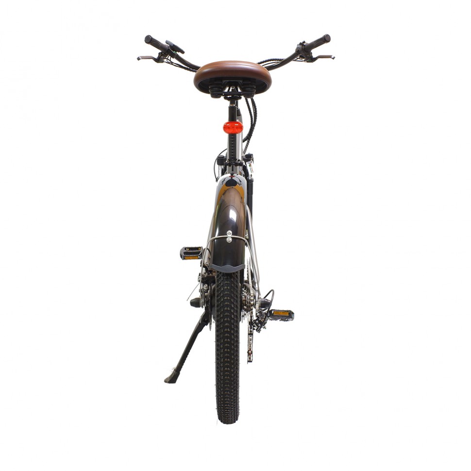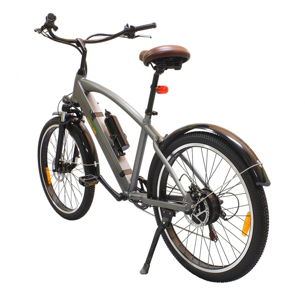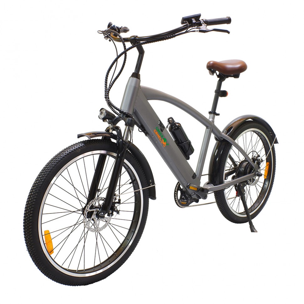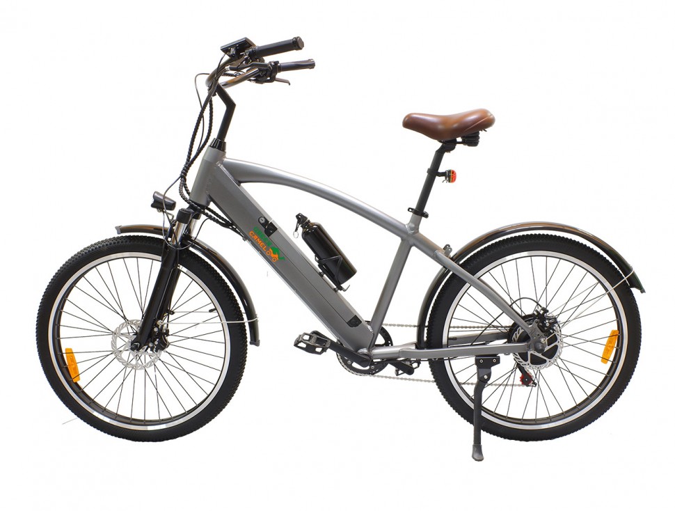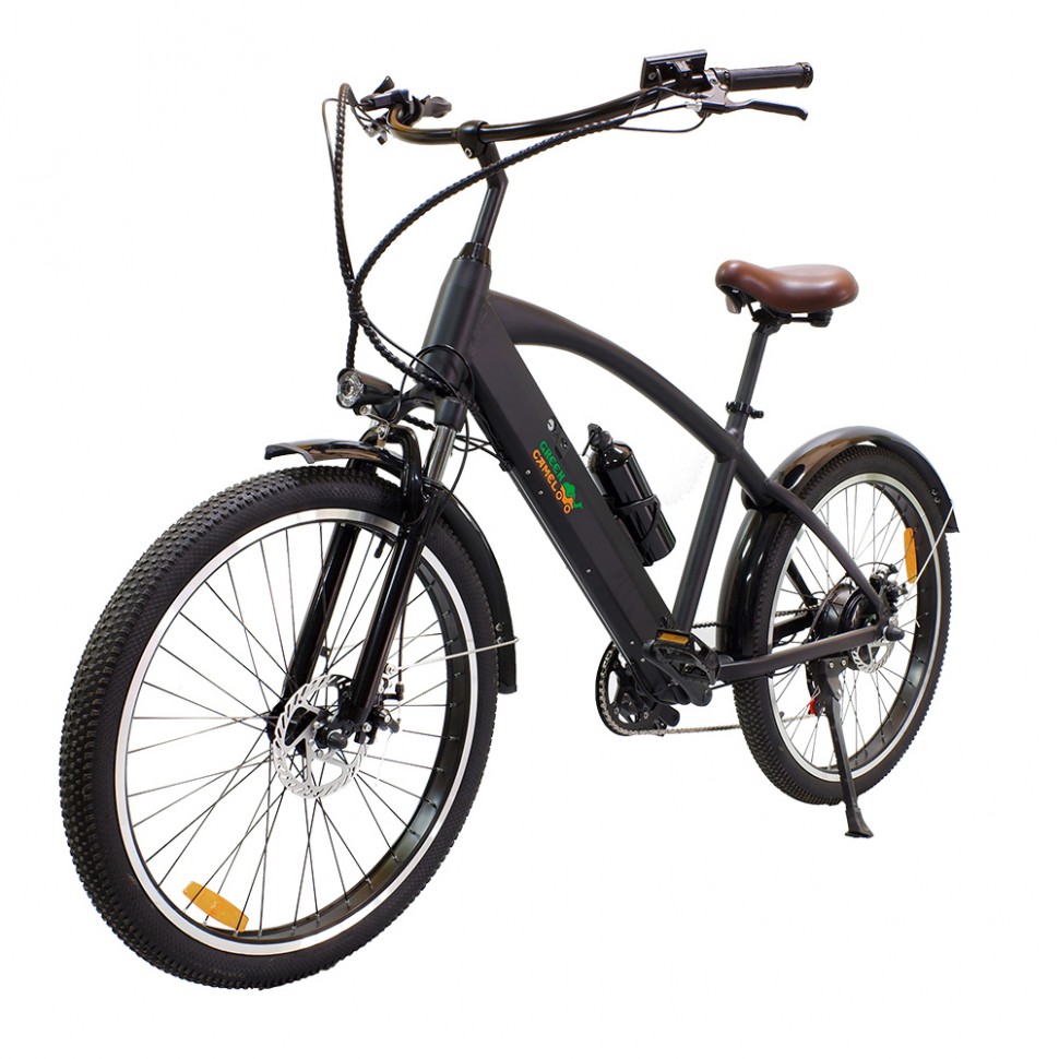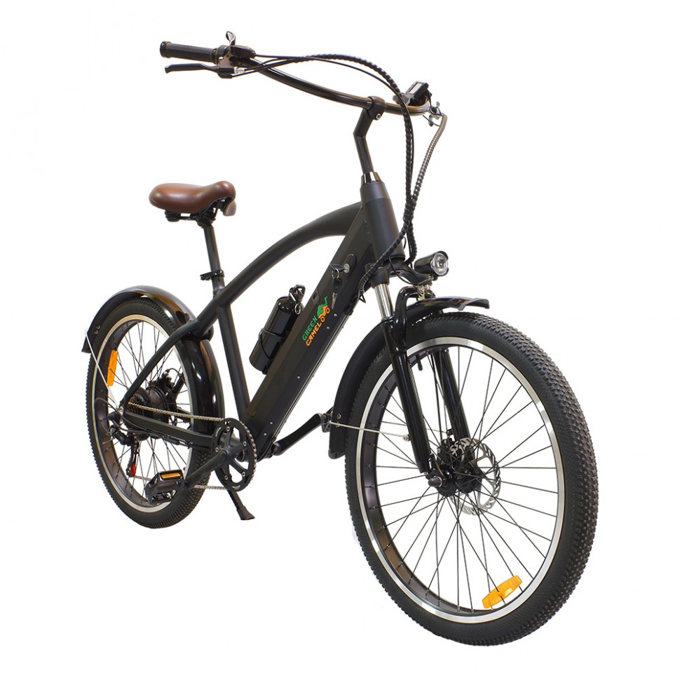 GreenCamel Санта классический представитель типа велосипедов - круизёров, предназначенных для спокойных комфортных прогулочных выездов. Плавные изогнутые линии алюминиевой рамы дополнены широким рулём для удобного хвата и широким мягким сиденьем на пружинах. Надёжный бесщеточный мотор мощностью 500W способен разогнать велосипед в режиме электрического помощника до 35 км/ч, а литиевая батарея ёмкостью 10Ah даст запас хода до 45 км на одном заряде. Безопасные остановки обеспечены дисковыми задним и передним тормозами. Электровелосипед GreenCamel Санта уже укомплектован крыльями, фарой, катафотами, информационным дисплеем, подножкой, зарядным устройством 110-240V, держателем и бутылкой для воды. Быстросъёмную батарею удобно уносить на зарядку, оставляя велосипед на хранение в вестибюле многоквартирного дома или на участке под навесом. Отзывчивый сервис GreenCamel на протяжении владения станет приятным плюсом к выбранному электровелосипеду.