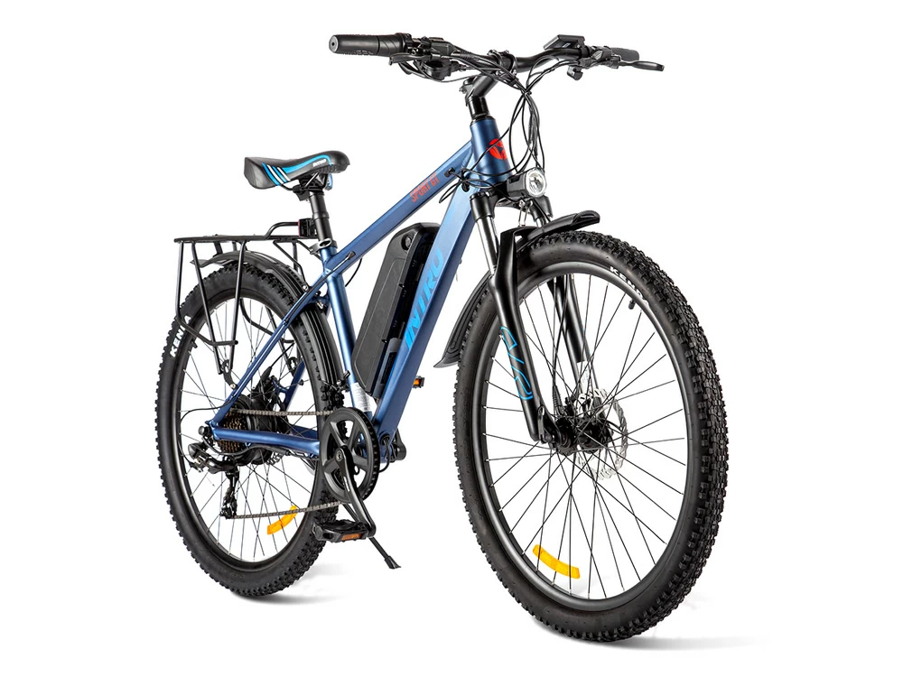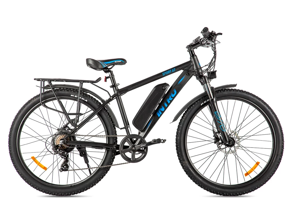 Рама INTRO Sport GT изготовлена из сплава алюминия, благодаря чему электровелосипед прочный, но в то же время легкий. Его вес – всего 21 кг. Рама – хардтейл. Передняя амортизационная вилка сглаживает дорожные неровности. Большие колеса диаметром 27,5 дюймов способствуют высокой проходимости по городским и загородным ландшафтам. Покрышки с универсальным протектором Kenda обеспечивают надежное сцепление с дорожным покрытием. Велогибрид оснащен качественным навесным оборудованием с 7 механическими скоростями, дисковыми гидравлическими тормозами, информативным дисплеем с 5 уровнями ассистента и гибкой системой настроек, передней светодиодной фарой, усиленным металлическим багажником, крыльями.