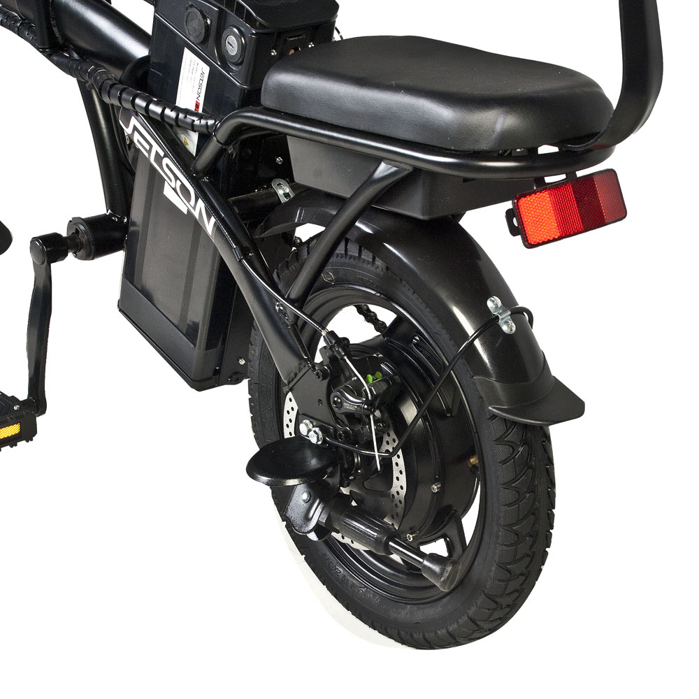 Мощность электродвигателя составляет 350 Вт, а емкость батареи - 8 А*ч, что позволяет развивать приличную скорость - до 45 км/час, и преодолевать расстояния до 42 км на одной подзарядке. Велосипед оснащен механическими тормозами и 14-дюймовыми накатистыми колесами. Батарея размещена за седельной частью в специальном блоке. Основная рама велосипеда сниженная, изготовлена из легкого алюминия, что делает его отличным выбором для представителей прекрасной половины. Анатомические переднее и пассажирское сиденья снижают нагрузку на позвоночник и предоставляют комфорт при длительных поездках.