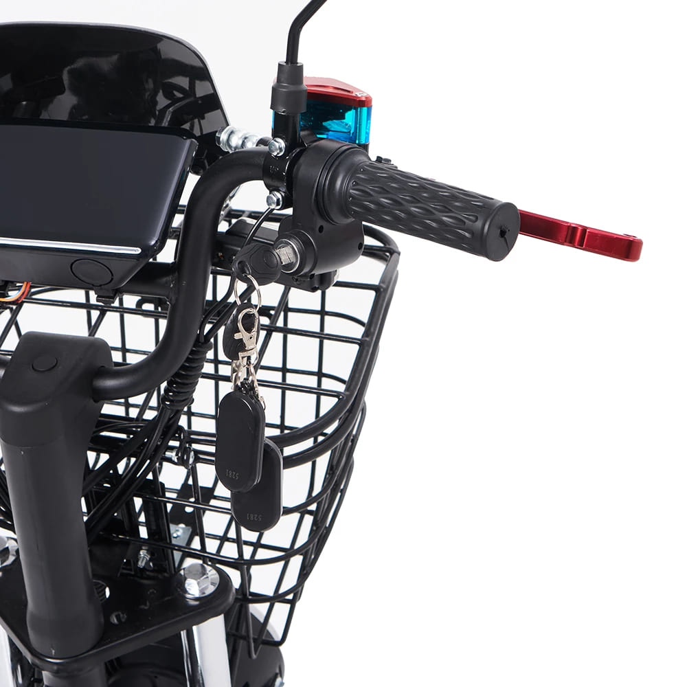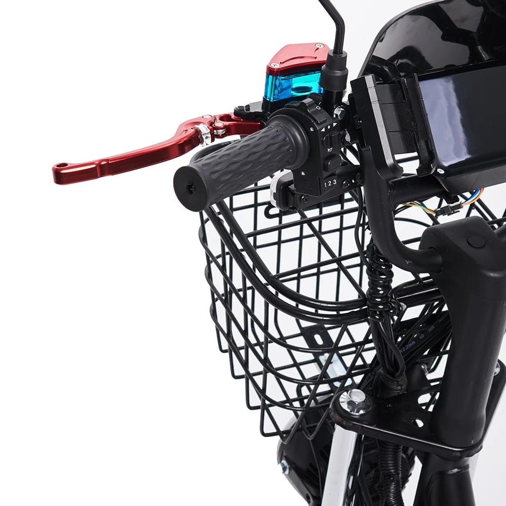 Удобная корзина на руле позволяет перевозить необходимые вещи, а сиденье для второго пассажира можно трансформировать в багажник для курьерской сумки. Дисковые гидравлические тормоза обеспечивают безопасное торможение, а мощная фара освещает путь в тёмное время суток.