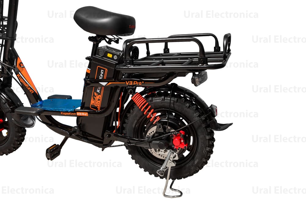 Kugoo Kirin V3 Pro Plus 28.6 Ah готов к использованию в любых погодных условиях, в том числе зимой. Установленные на нём шипованные покрышки обеспечивают отличное сцепление с дорогой, а полная гидроизоляция защищает от влаги и грязи. Кроме того, электровелосипед оснащён курьерским багажником, который позволяет удобно перевозить необходимый груз.