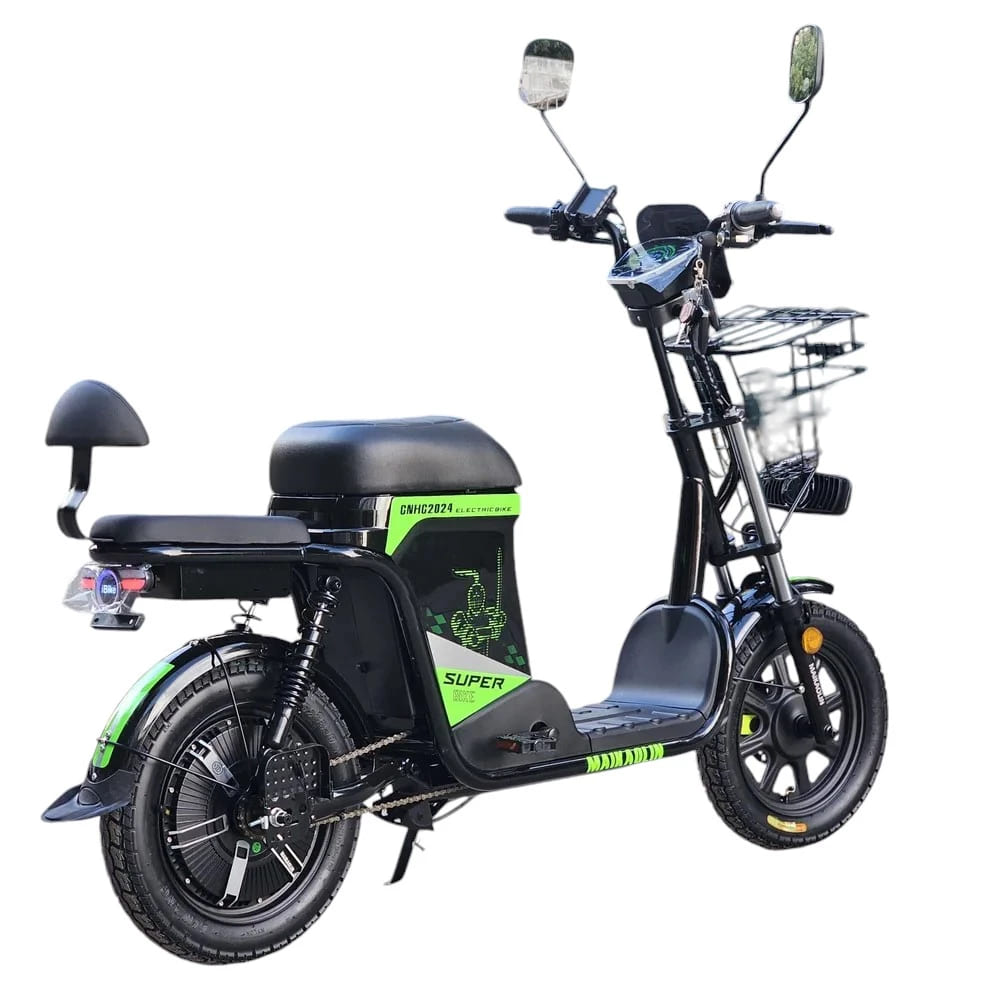 Дизайн электровелосипеда напоминает скутер, но наличие педалей делает его ещё более универсальным. Мощный аккумулятор на 40 Ah позволяет проехать на одном заряде до 60 км, а платформа для ног добавляет комфорта во время поездки.
