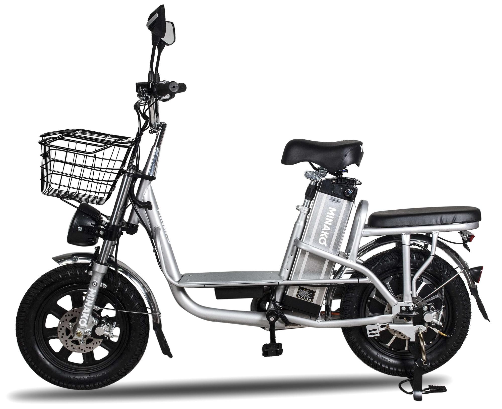 Конструкция рамы велосипеда надежна и низкая. Компания Minako сделала эту модель лучше, чем когда-либо. Она оборудована качественными педалями и прочным багажником. Электромотор мощностью 500 Вт способен разогнать велосипед до скорости 60 км/час.