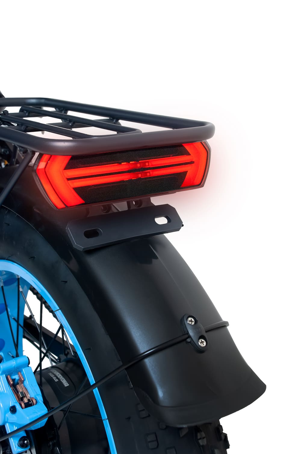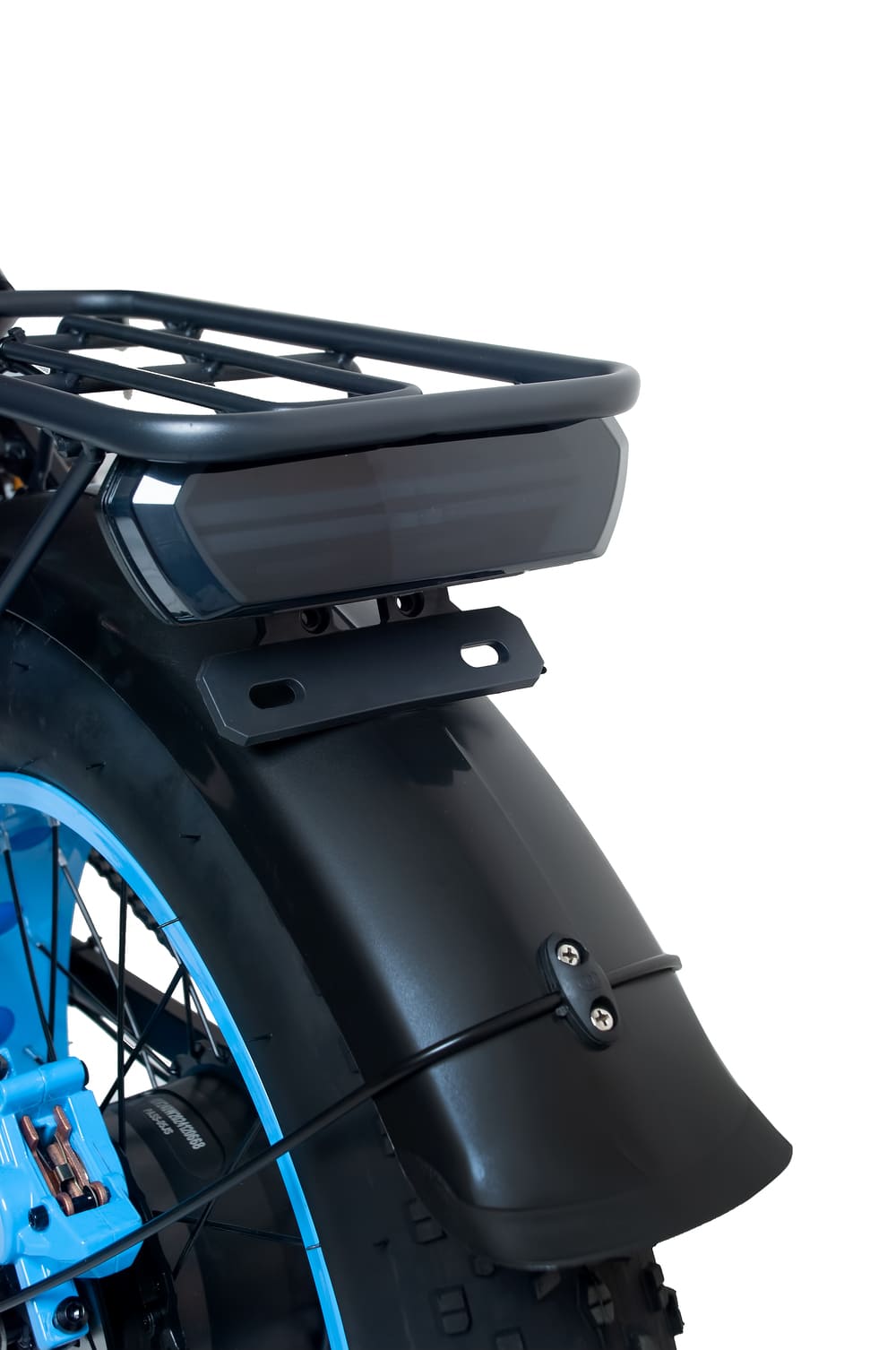 Конструкция электровелосипеда разработана с учетом практичности и удобства. Рама выполнена из легкого и прочного алюминия и имеет складную конструкцию, что значительно упрощает транспортировку и хранение. Размер шин спереди и сзади составляет 20x4, обеспечивая отличное сцепление с дорогой. Передний амортизатор поглощает неровности дороги, делая поездку более комфортной. В комплектацию также входит багажник, который позволяет перевозить дополнительные грузы.