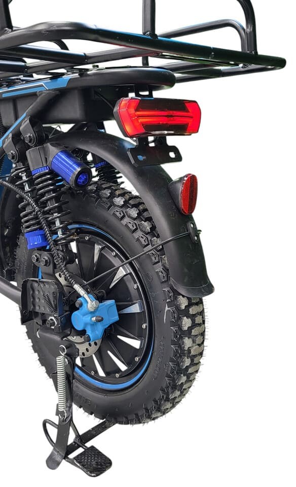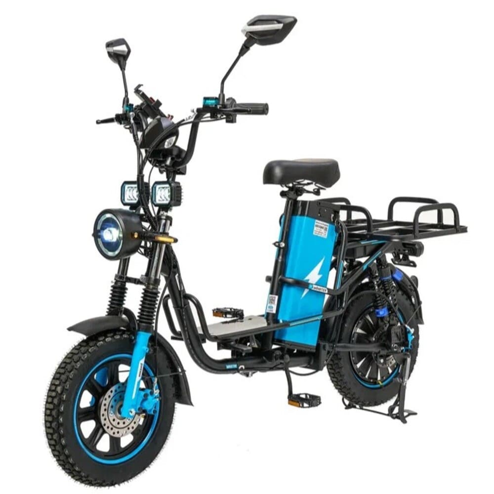 Электровелосипед оснащен аккумулятором типа Li-ion напряжением 60 В и ёмкостью 30 000 мА·ч, обеспечивающим увеличенный запас хода до 80 км на одном заряде. Полная зарядка занимает 8 часов, а съёмная батарея легко интегрируется в прочную низкую раму из алюминия, обеспечивая устойчивость и удобство посадки. Это делает поездки более комфортными, особенно для пользователей разного роста.