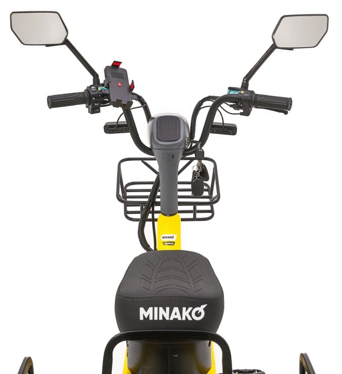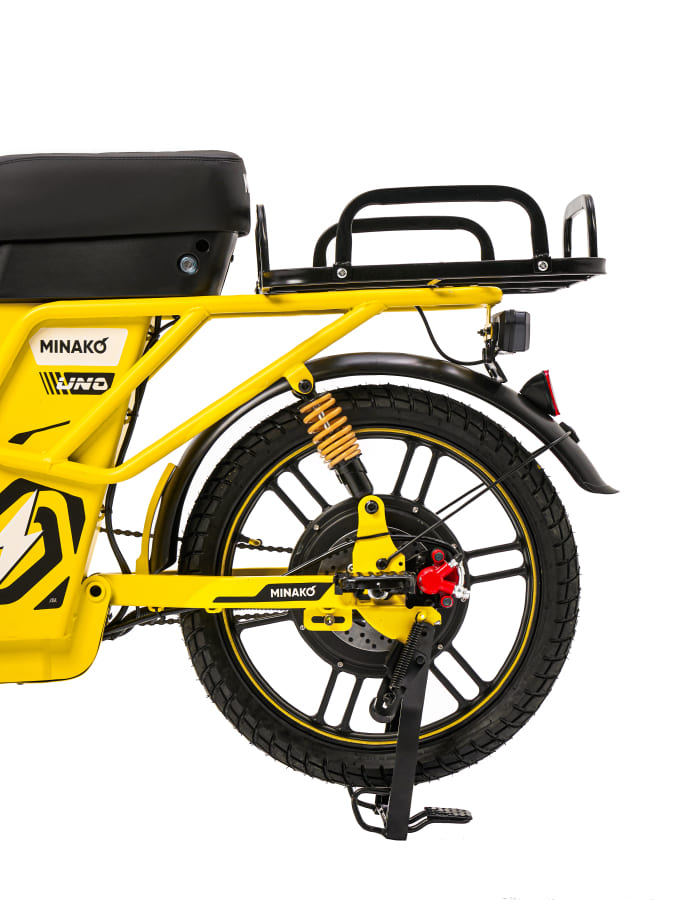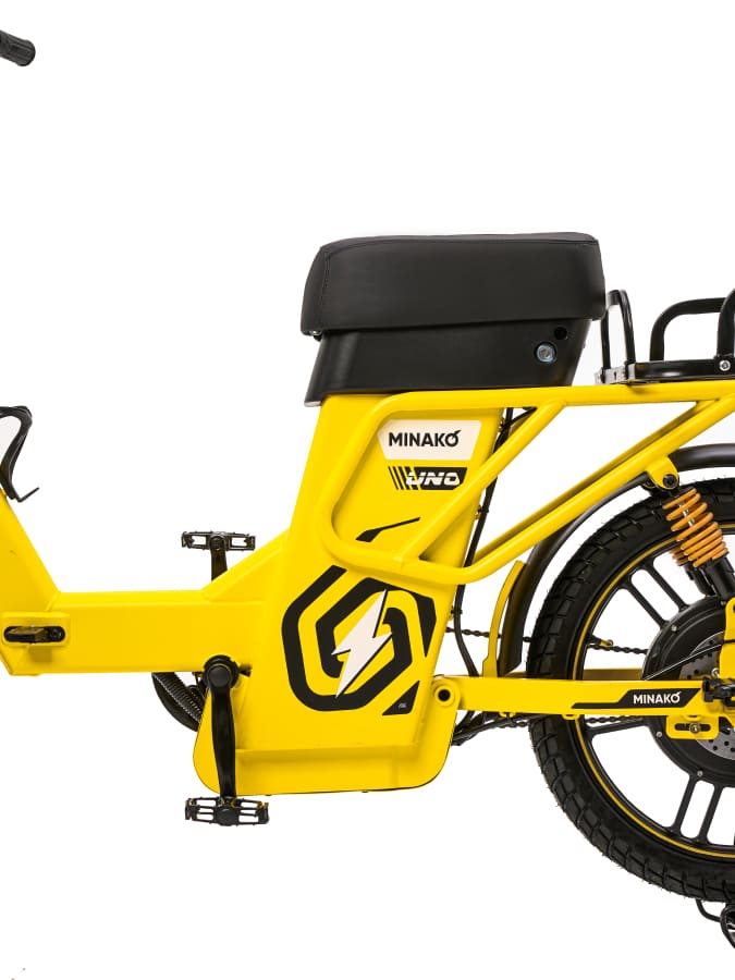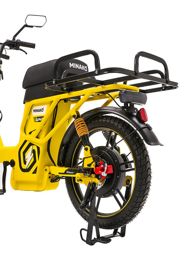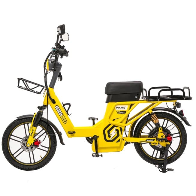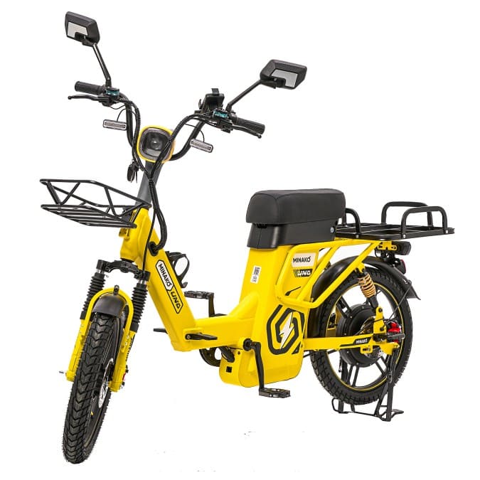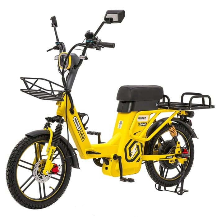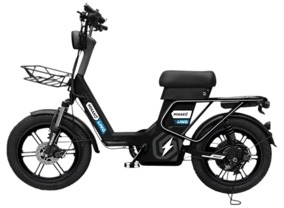 Minako UNO оснащён практичными элементами: передней корзиной и багажником, которые позволяют перевозить сумки, покупки или служебное оборудование. Это делает его идеальным выбором для доставки, курьерской службы или семейного использования. Сочетание высокой мощности, длительного пробега и функциональности делает этот электровелосипед универсальным решением для повседневных задач и активного отдыха.