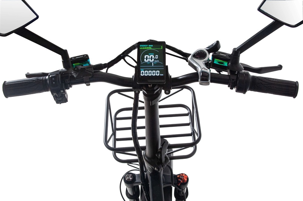 Максимальный функционал этой техники позволяет контролировать скорость, уровень заряда аккумулятора и дистанцию преодоления. Наличие зеркал заднего вида, вместительной передней корзины и заднего багажника делает эксплуатацию удобной и практичной. Этот электровелосипед позволяет безопасно перемещаться по улицам среди других участников движения и использовать его в повседневной жизни, будь то поездки на работу или по магазинам, а также перевозить детей на небольшие расстояния.
