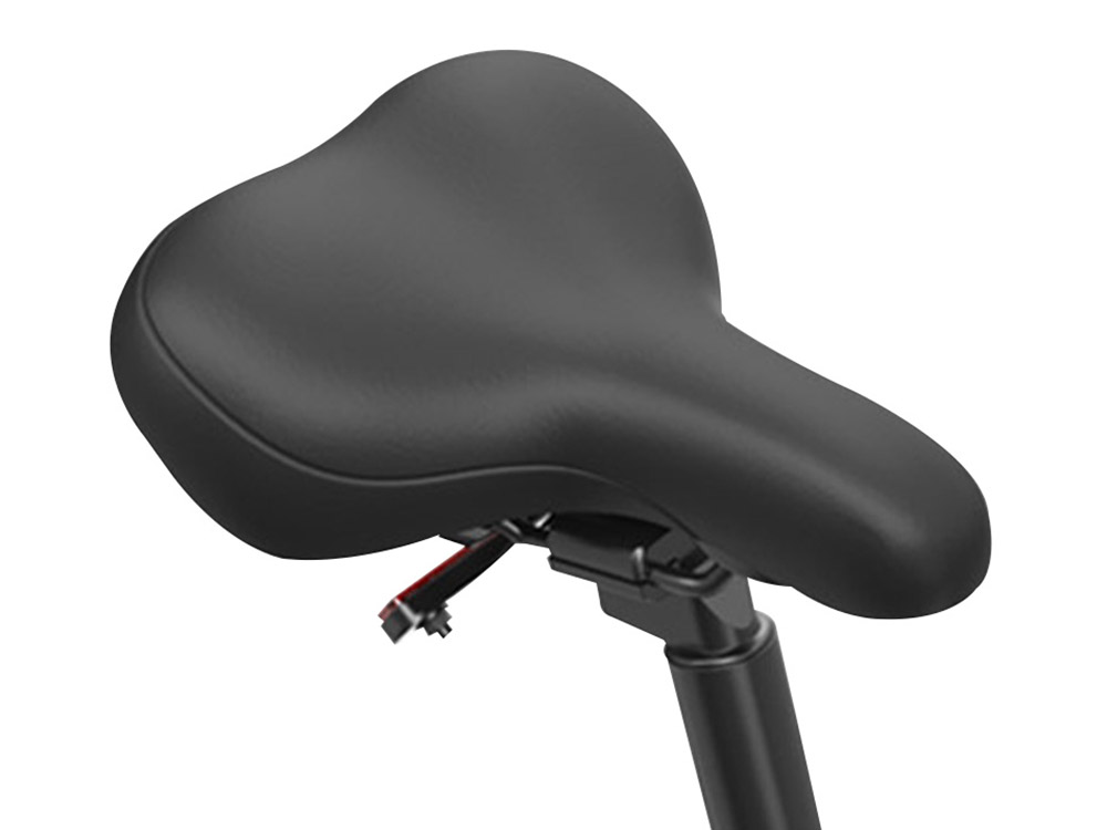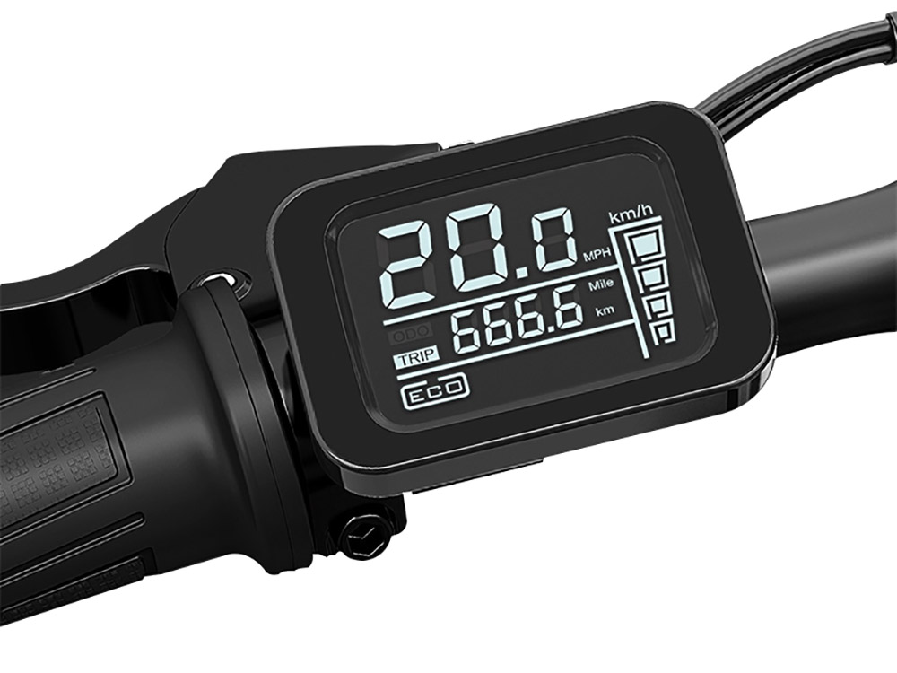 Электровелосипед оборудован складным механизмом, что обеспечивает легкость хранения в багажнике или подъезде. На руле установлен ЖК-дисплей с ясным отображением уровня заряда, скорости и пройденного расстояния. Дисплей обладает степенью защиты IPX7. Для комфортной поездки заднее колесо оснащено амортизатором нового поколения, который эффективно смягчает движение и исключает появление тряски.