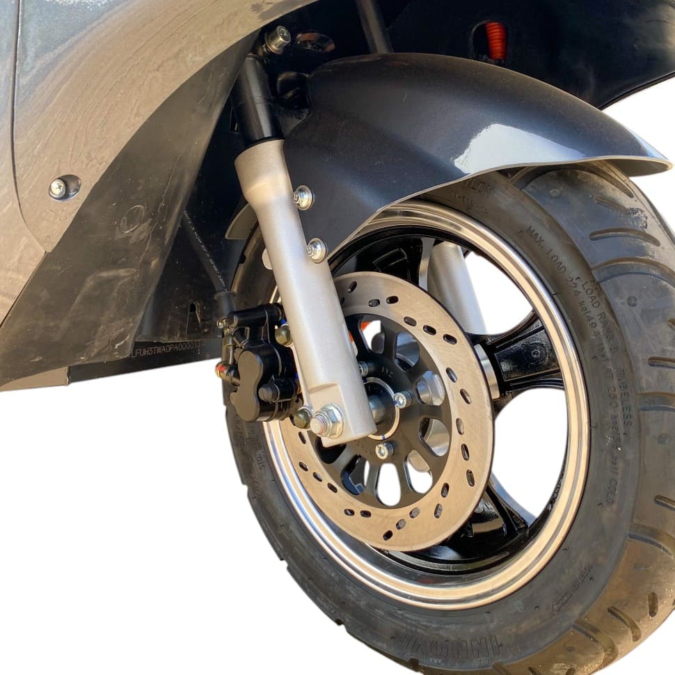 Конструкция трицикла разработана с учетом комфорта и безопасности. Он оснащен дисковыми тормозами как спереди, так и сзади, что гарантирует надежное торможение даже при полной загрузке. Колесная база составляет 1845 мм, а дорожный просвет — 130 мм, что обеспечивает устойчивость и маневренность. Размер шин передних колес — 100/80-12, задних — 4.00-12, а наличие амортизаторов делает движение плавным даже на неровных поверхностях.