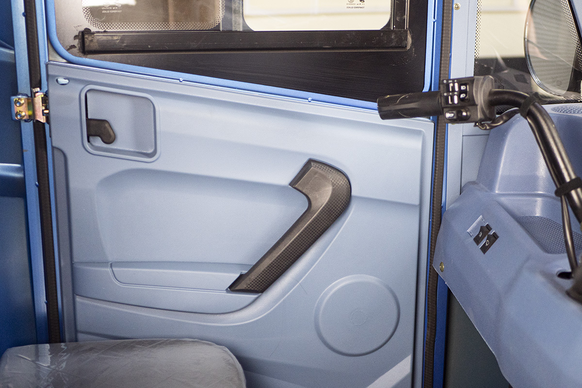 Откидные борта кузова позволяют легко выгружать крупногабаритный груз. Герметично закрытая кабина допускает езду при любых погодных условиях, открывается с двух сторон. Транспортное средство оснащено линзованной светодиодной фарой.