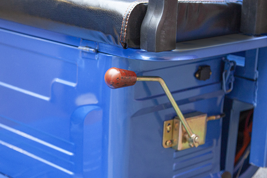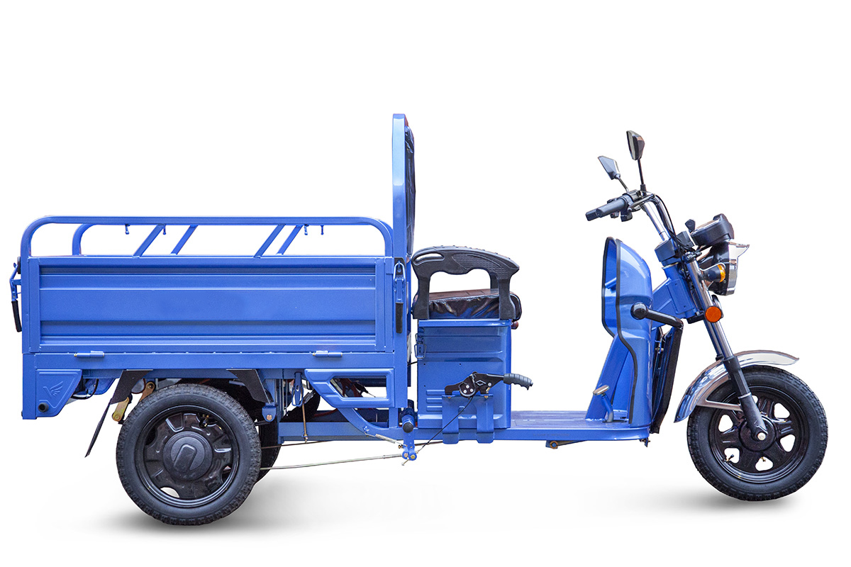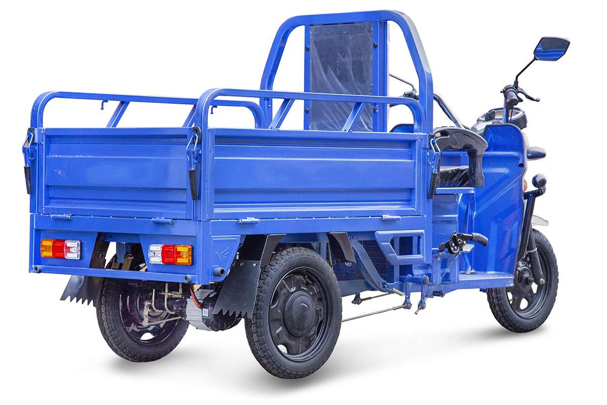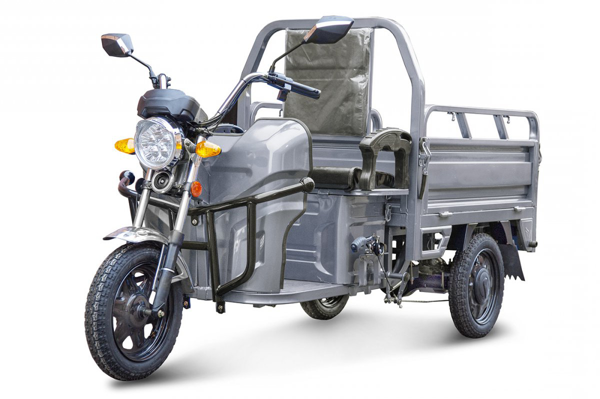 Передние и задние колеса диаметром 12 дюймов комплектуются покрышками с развитыми грунтозацепами. В процессе езды электрический трицикл демонстрирует повышенную устойчивость и хорошую маневренность, даже при полной загрузке. На трицикле установлена противоугонная сигнализация.