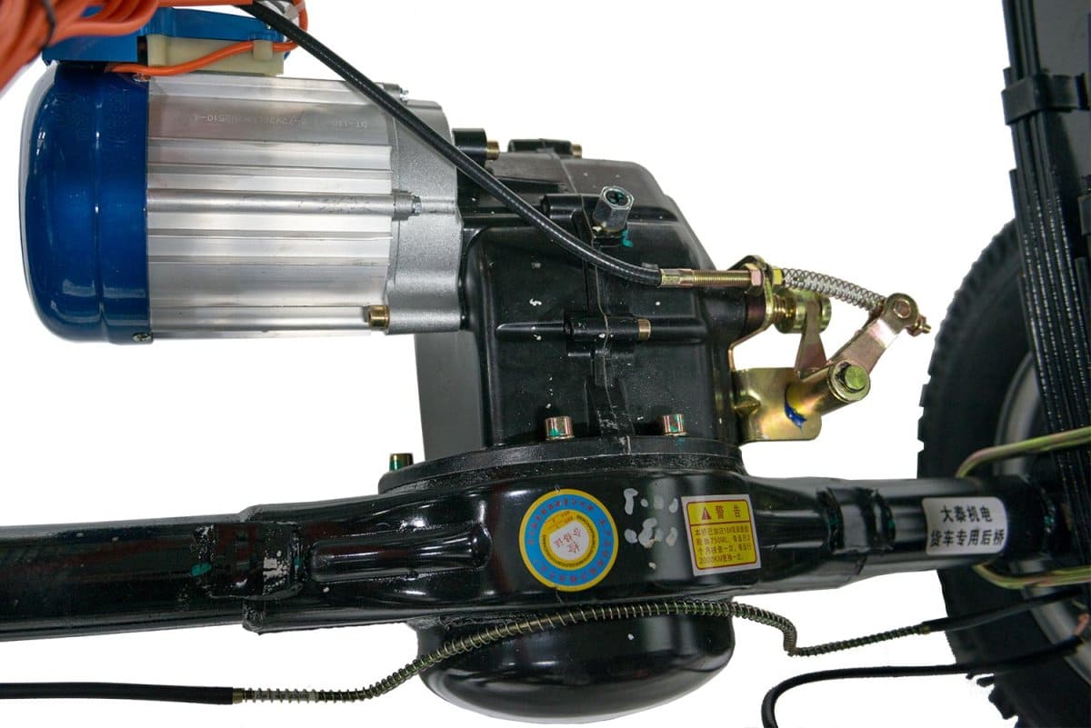 Для комфортной и устойчивой езды с тяжёлым грузом установлены гидравлическая вилка спереди и рессорная подвеска сзади, эффективно смягчающие удары и распределяющие нагрузку. Тормозная система — комбинированная: барабанный тормоз спереди и гидравлический ножной тормоз сзади, обеспечивающие надёжное и безопасное торможение даже под максимальной нагрузкой. Также предусмотрена пониженная передача для движения по крутым подъёмам.