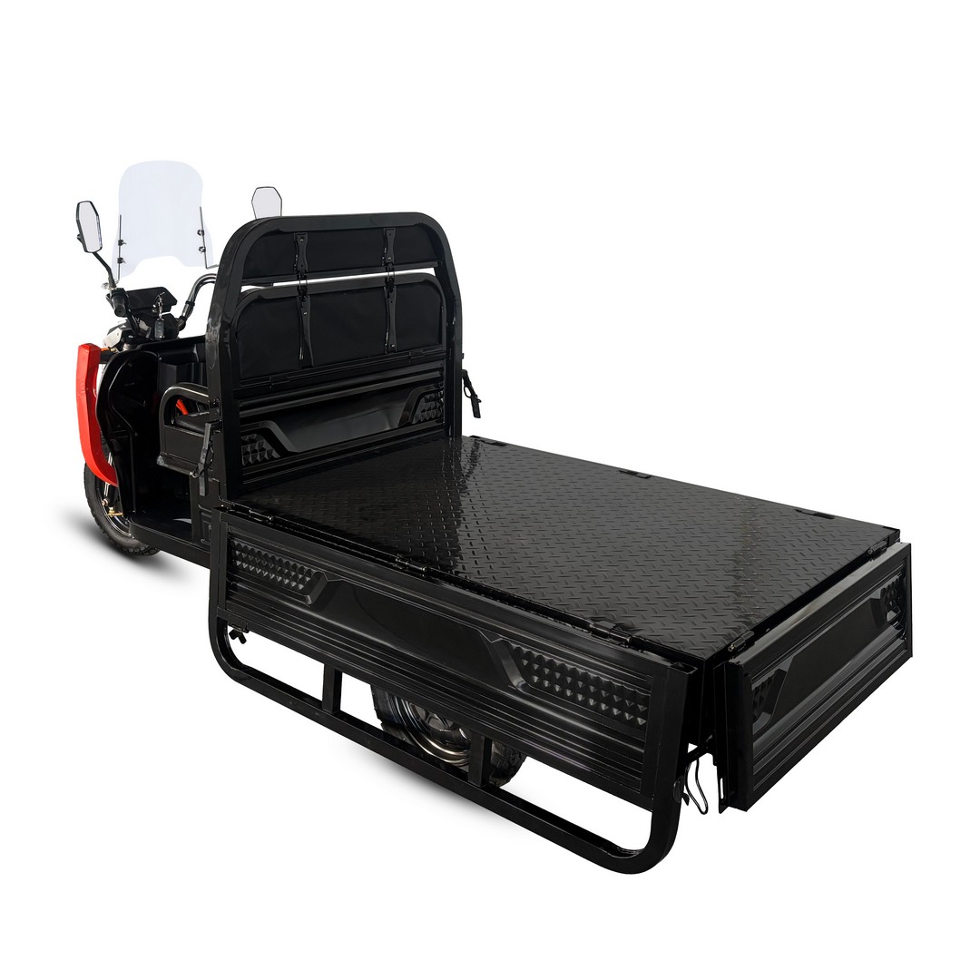 Грузовая платформа размером 1500×1000×450 мм оптимизирована под стандартные поддоны и повседневные грузы. Она усилена двумя вертикальными рёбрами жёсткости, а борта выполнены из ребристого металла и откидываются на быстросъёмных петлях, превращаясь в расширенную площадку. Антискользящее покрытие с насечками надёжно фиксирует груз. Общий сухой вес модели — 311 кг, а габариты 2960×1000×1350 мм обеспечивают отличную маневренность в городских условиях.